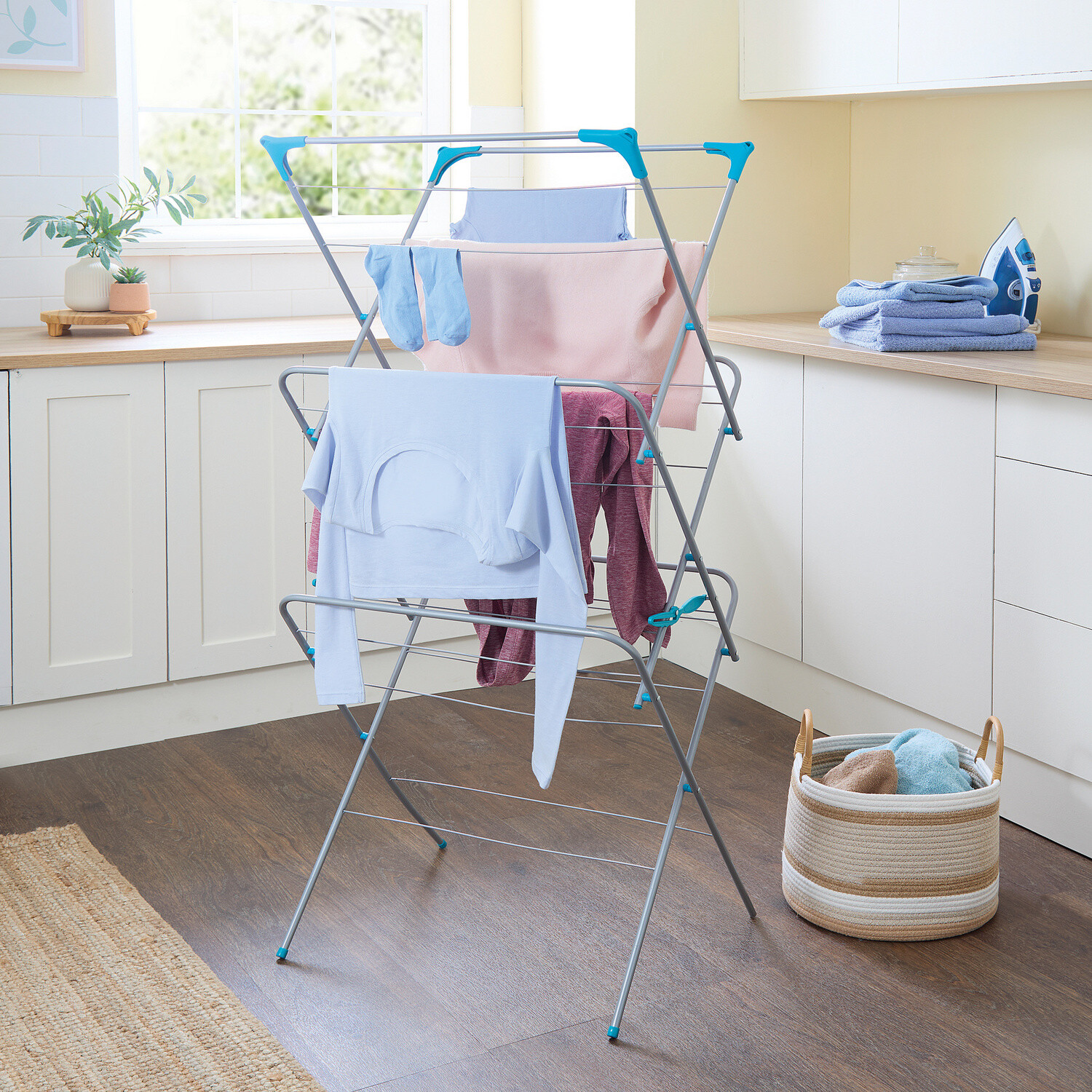 Ez az erős forgószárító egy helytakarékos csoda: több mint 16 méter szárítókötéllel a legkisebb helyen is elfér - pl. a fürdőszobában, az erkélyen stb. Stabil alumíniumszerkezet 4 lábon, kiegészítő merevítőkkel - kellemesen könnyű és abszolút stabil, még szélben és viharban is. Egyszerűen felállítható és egy gombnyomással összezárható - szerszámok nélkül!