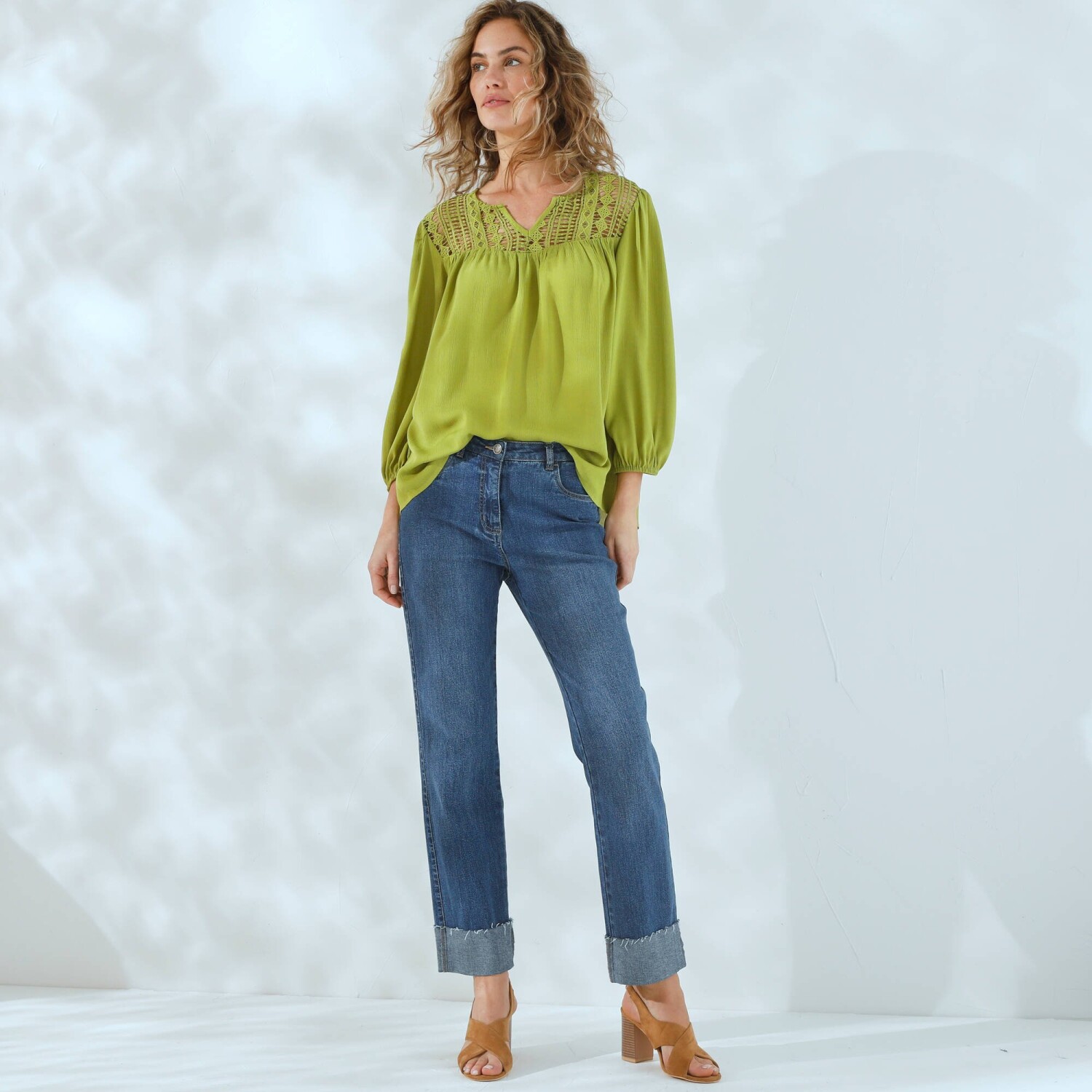 Stílusos, könnyű és kényelmes. Ez a 3 szó jellemzi legjobban egy divatos, pöttyös mintás blúzt. Légies krepp anyagból készült, kényelmes viselet. Tunéziai nyakkivágás, áttört "V" alakkal. A nyakkivágás alatt ráncolások. Hosszú ujjak, gombos patenttal a 3/4-es felhajtáshoz. Lekerekített alsó szegély. Mosógépben mosható.