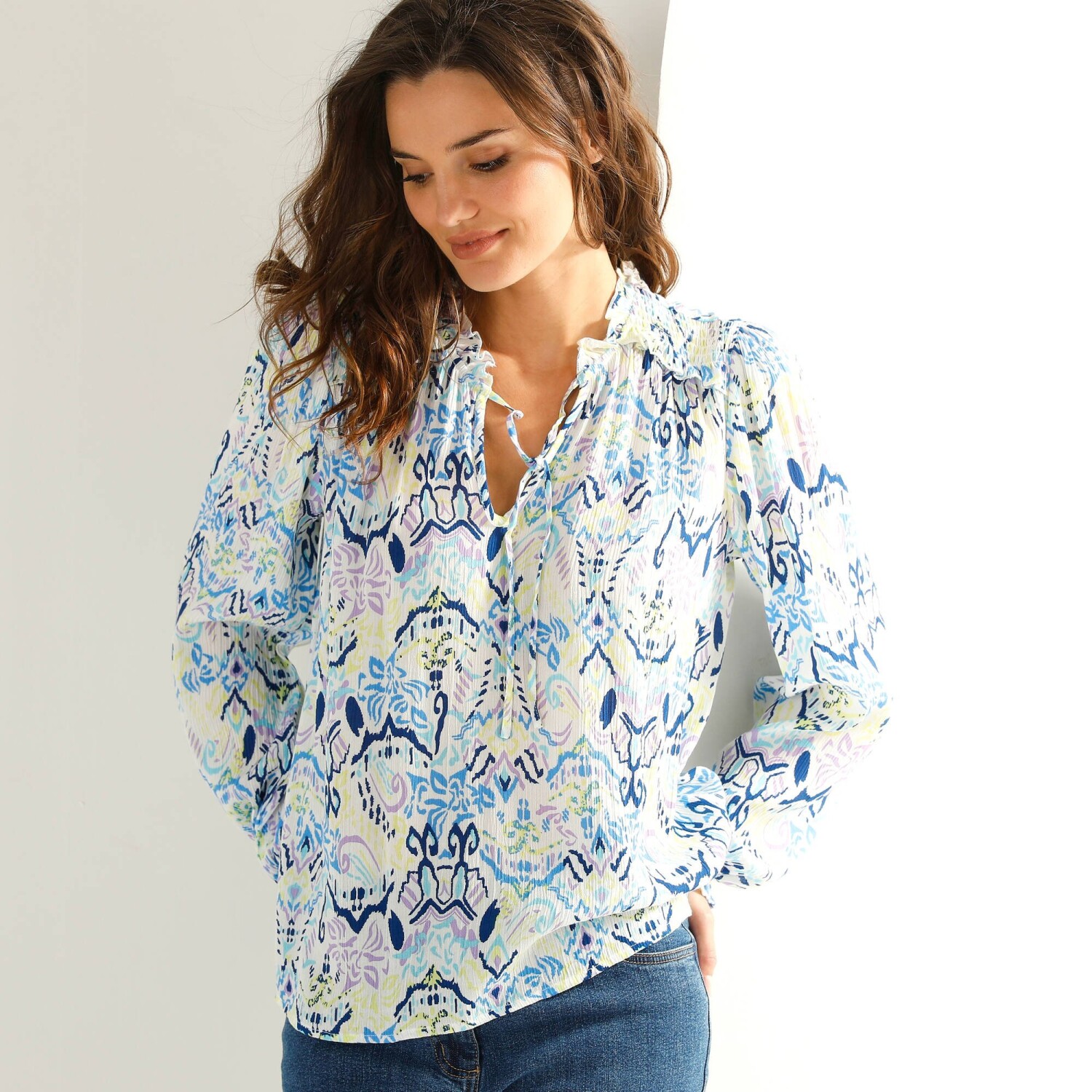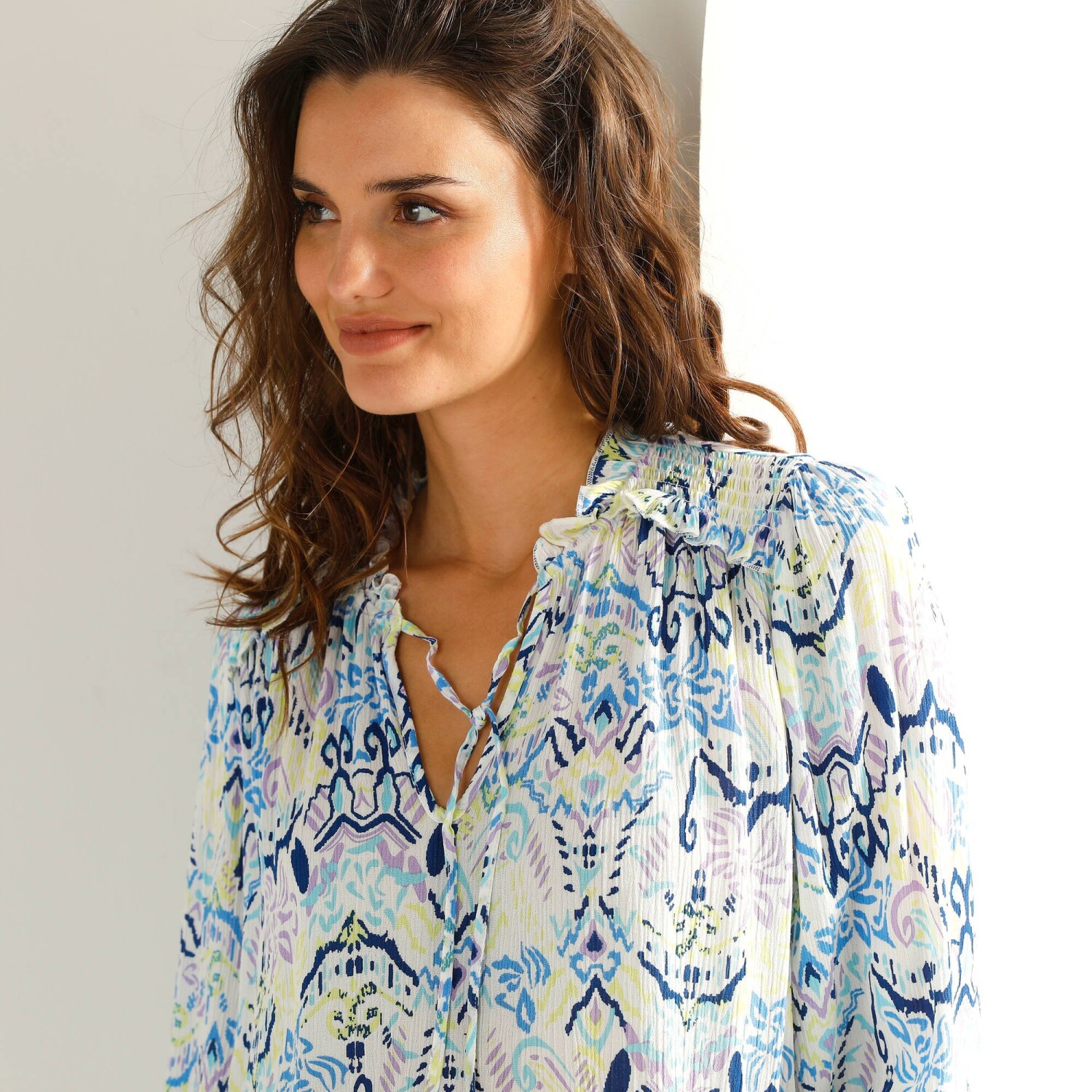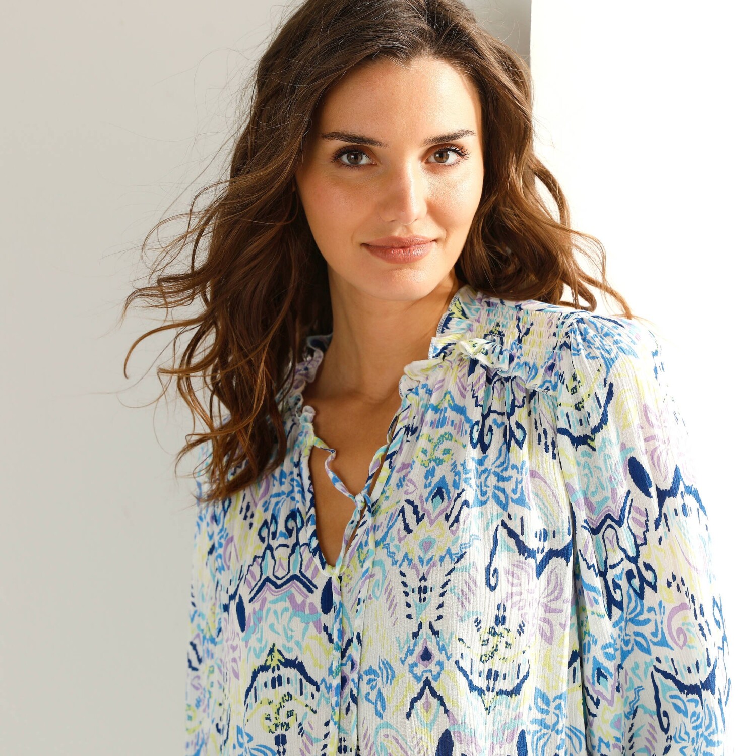 Bájos blúz pöttyös mintával: kényelmes anyagból készült, nőies szabással és divatos mintával. Lekerekített V-nyakú. Elöl teljes gombos záródással. Elülső vállrés és fodrok. Az ujjak felső része fodros. Rövid ujjak elasztikus mandzsettával. Egyenes szegély. Gépben mosható.