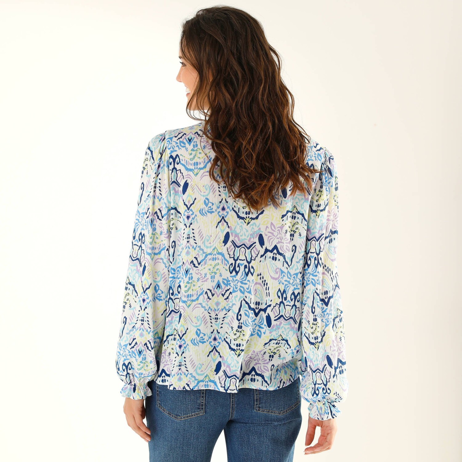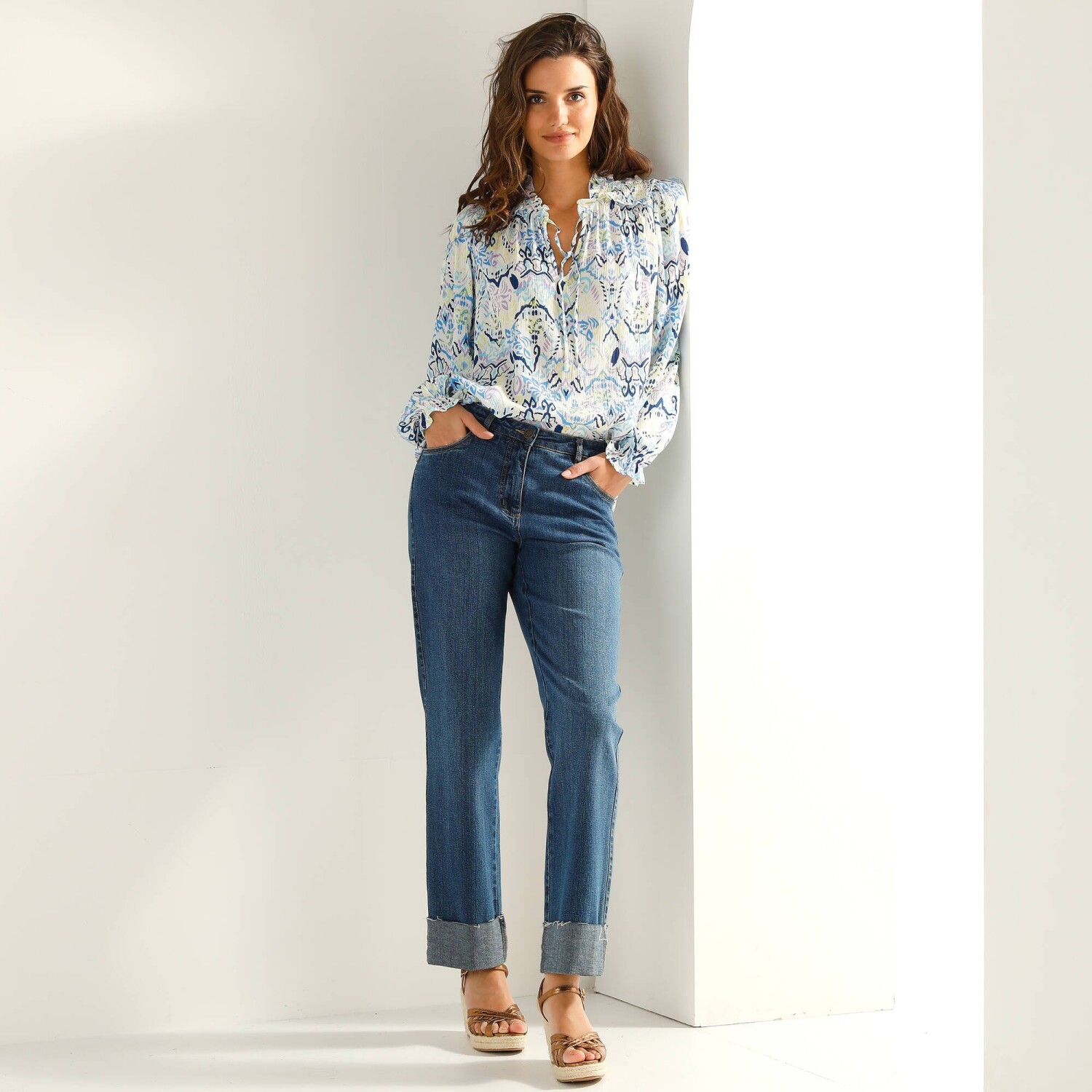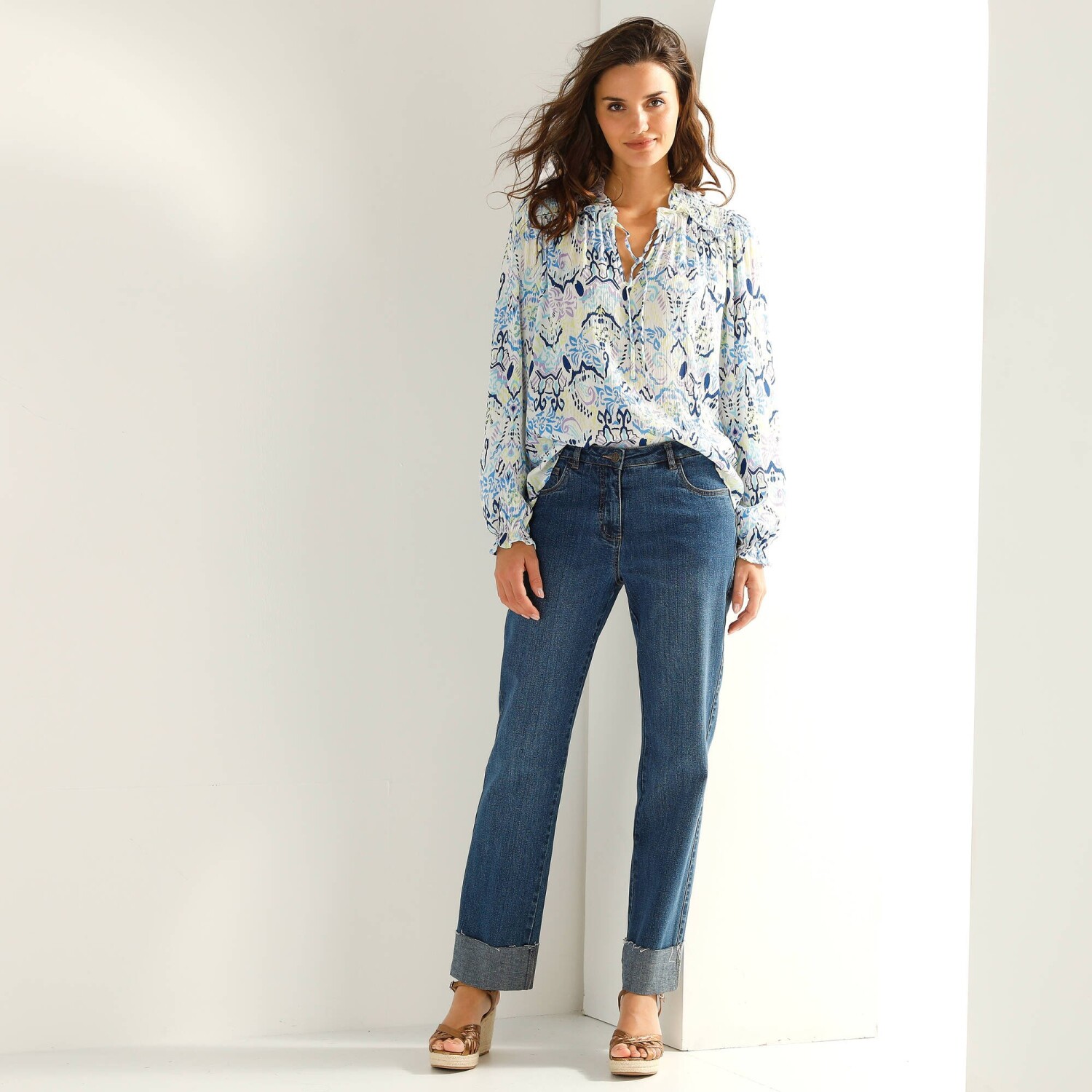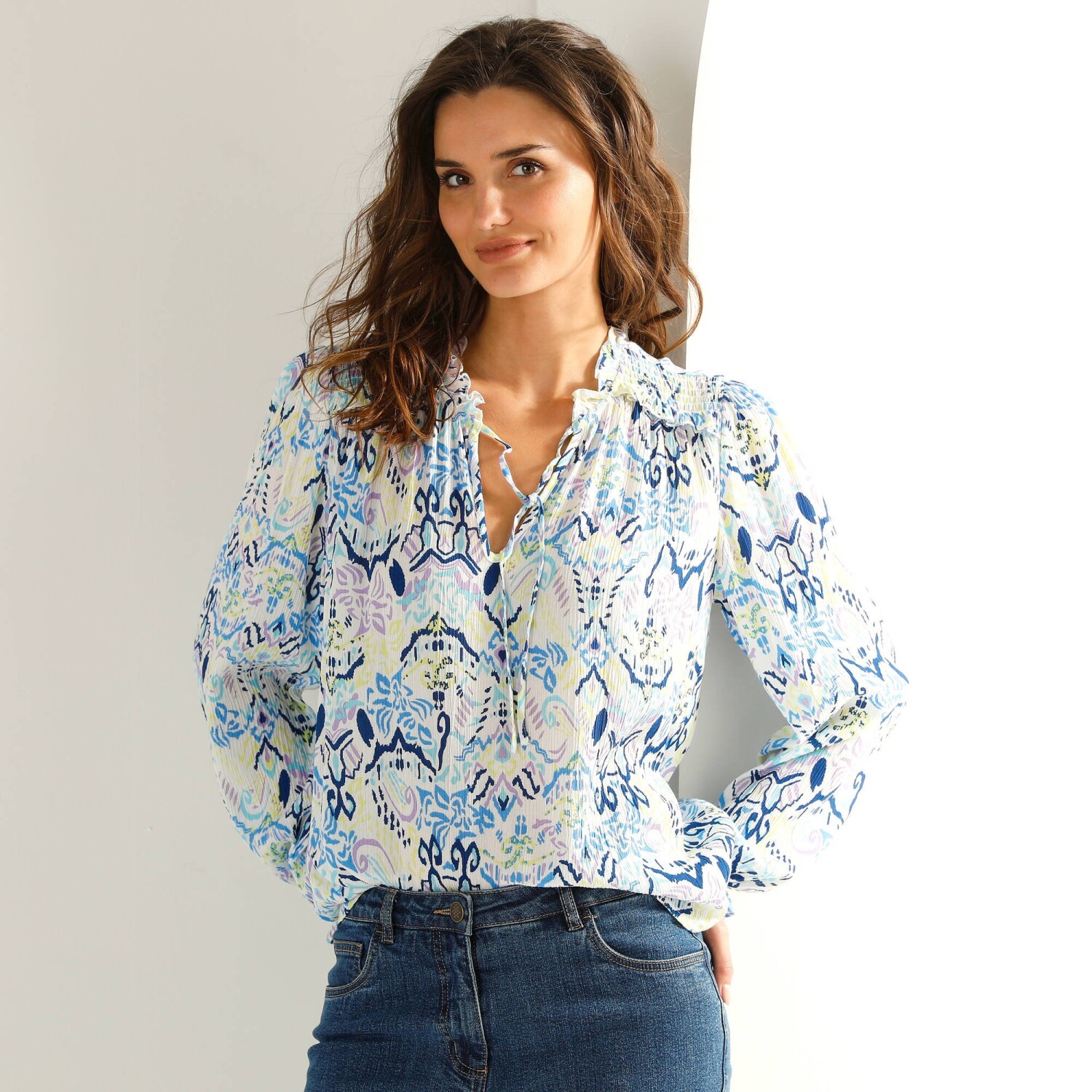 Bájos blúz pöttyös mintával: kényelmes anyagból készült, nőies szabással és divatos mintával. Lekerekített V-nyakú. Elöl teljes gombos záródással. Elülső vállrés és fodrok. Az ujjak felső része fodros. Rövid ujjak elasztikus mandzsettával. Egyenes szegély. Gépben mosható.