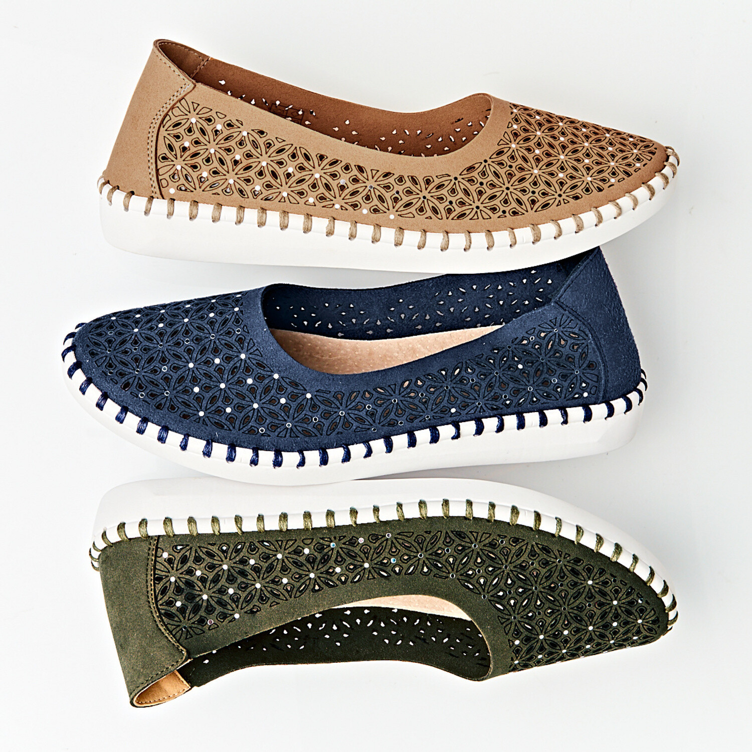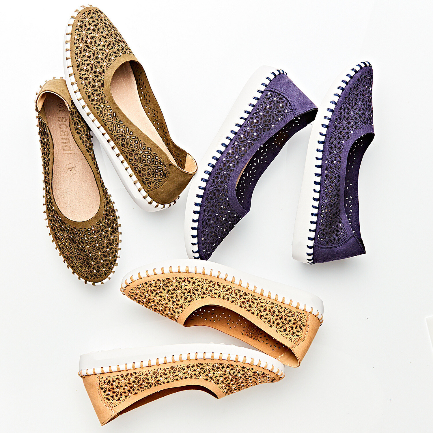 Ezek a balerinák táncoló virágmintával, strasszkövekkel és divatos varrásokkal kápráztatnak el. Virágok + strasszkövek. Puha, mint a nubuk bőr. Könnyű + légies. Jó párnázás. bézs színű. Passzol a kézitáskáinkhoz.