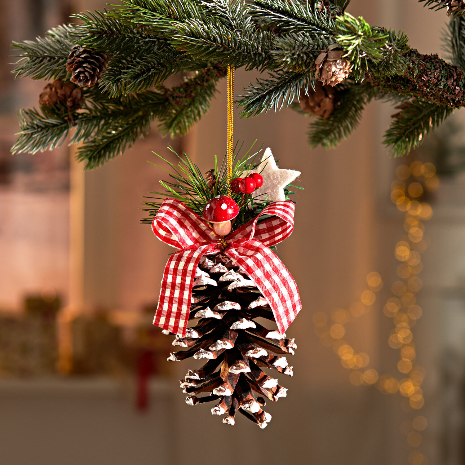 A fán vagy karácsonyi dekorációban ez a kockás masnival díszített toboz díszíti és vonzza a tekintetet. Igazi toboz. Gazdagon díszített. Sokoldalúan felhasználható.