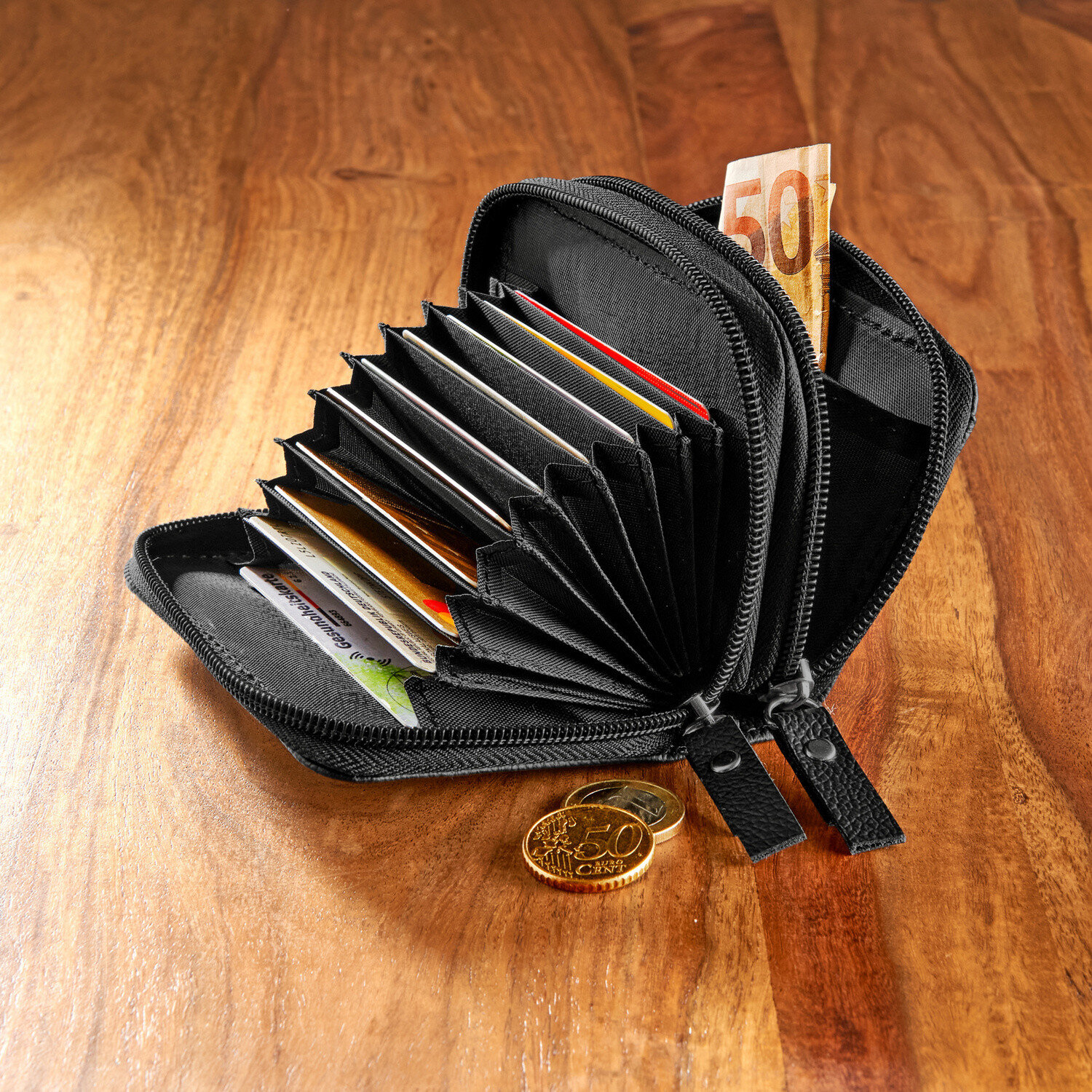 Kicsi, kompakt és áttekinthető! Ez az okos dupla pénztárca rengeteg rekesszel rendelkezik kártyák, igazolványok, bankjegyek és érmék tárolására. Számos rekesz. 2 cipzárral zárható. Mindkét rész külön nyitható.
