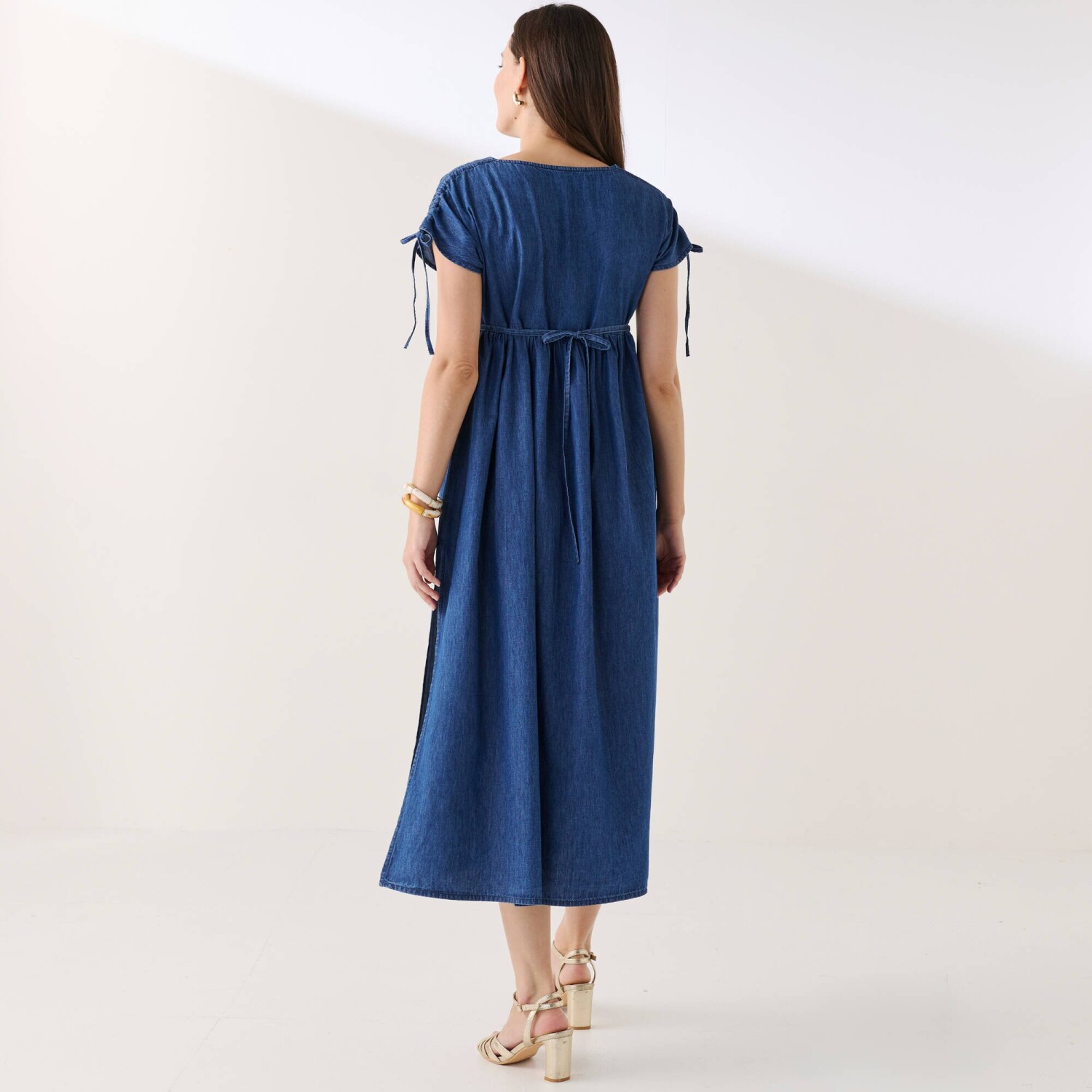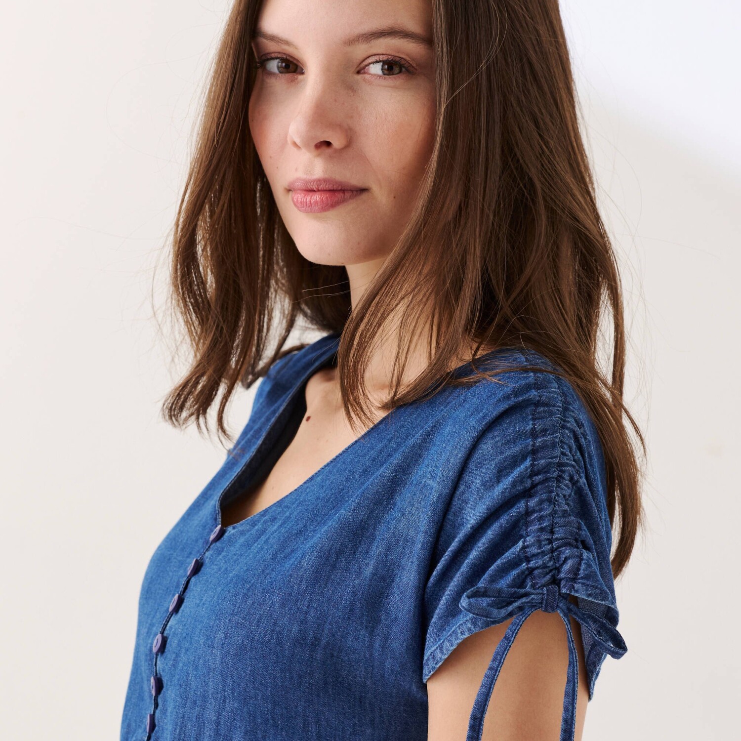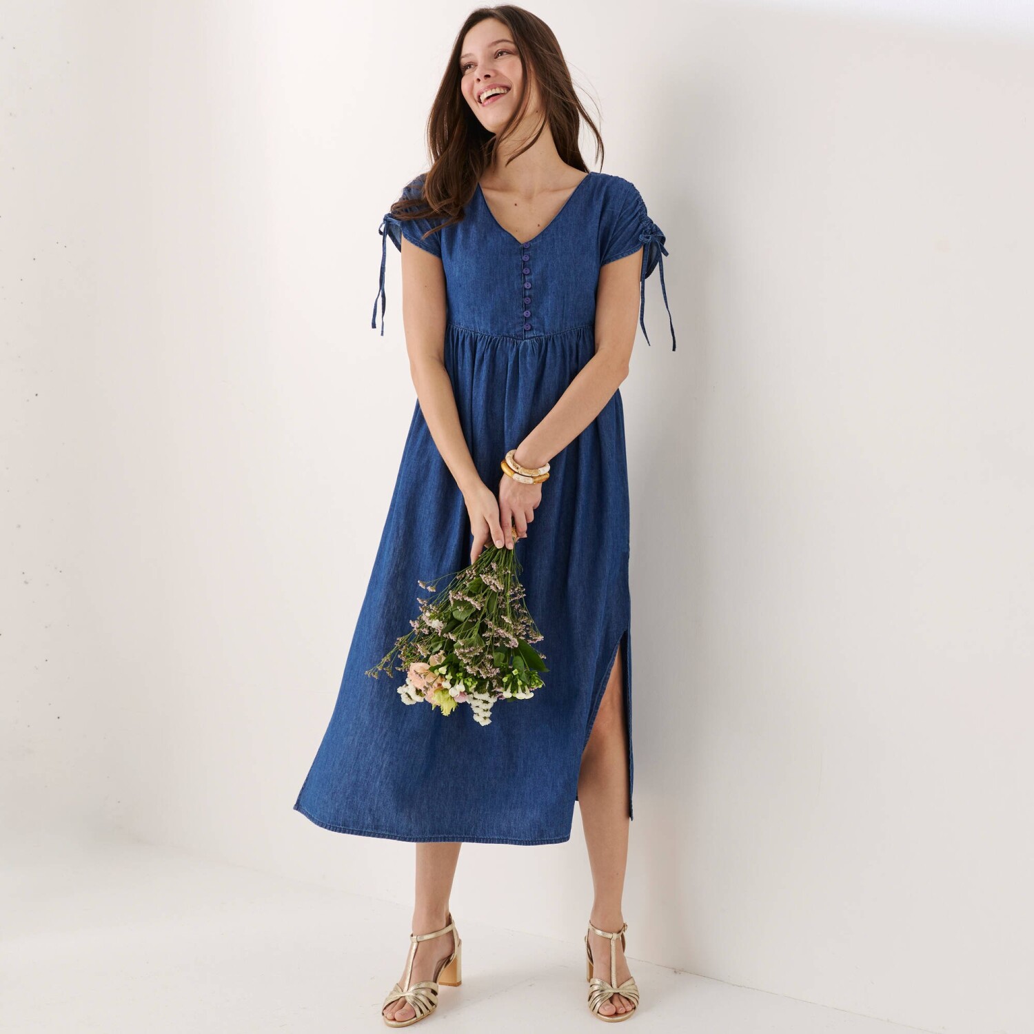 Egy öves midi ruha játékosan varázsol városi megjelenést. Légies krepp anyag enyhén gyűrött kivitelben. Könnyen kezelhető. Nőies V-nyakú kivágás. Derékban kivágás és megkötős öv, 3 ruhahurok. Rövid ujjú, ejtett váll. 1 zseb a jobb oldalsó varrásban. 2 fedőzseb elöl. Elöl térdig érő hasíték. 2 sliccelt varrás elöl és hátul. Rejtett cipzár a bal oldalon. Szélesített alsó szegély. Mosógépben mosható.