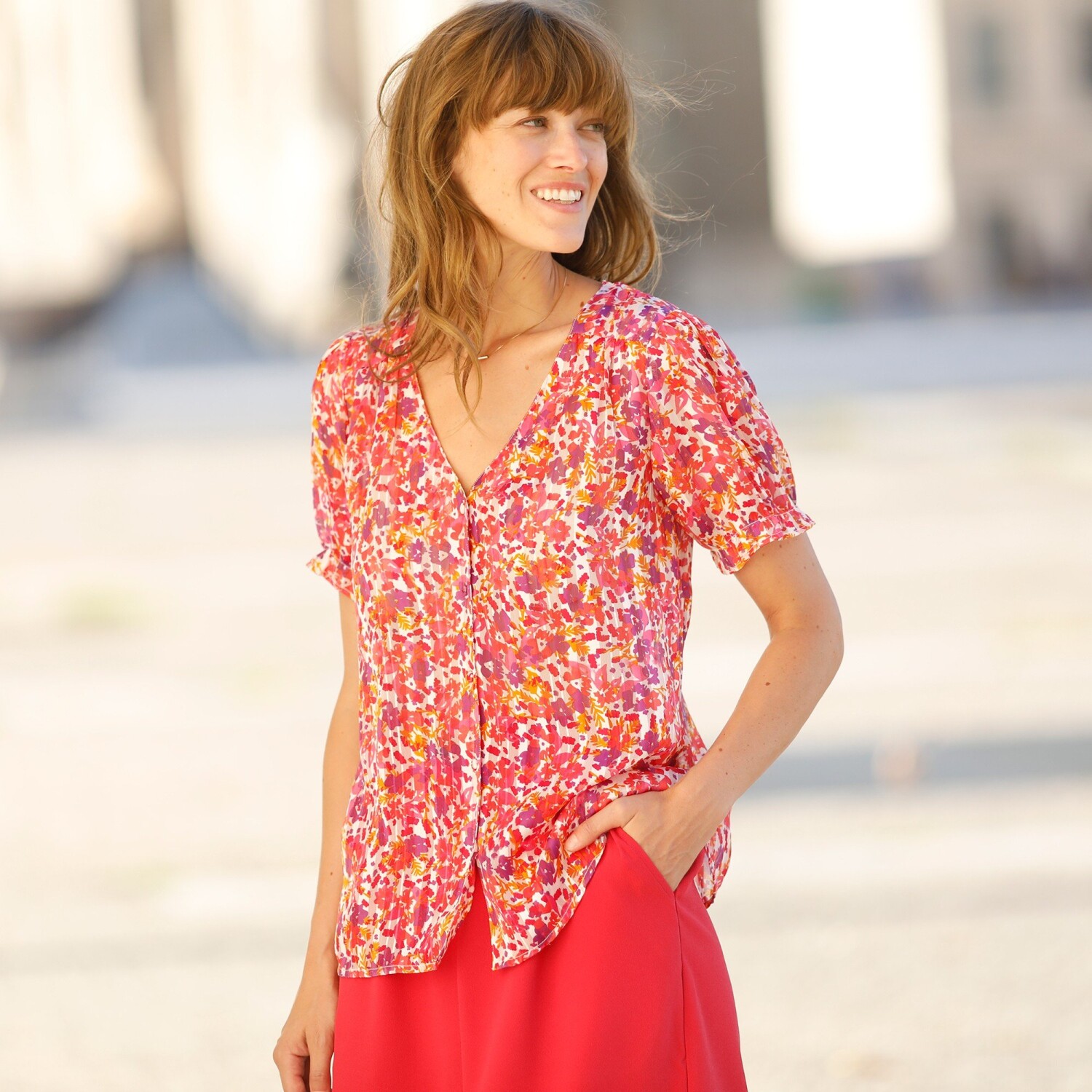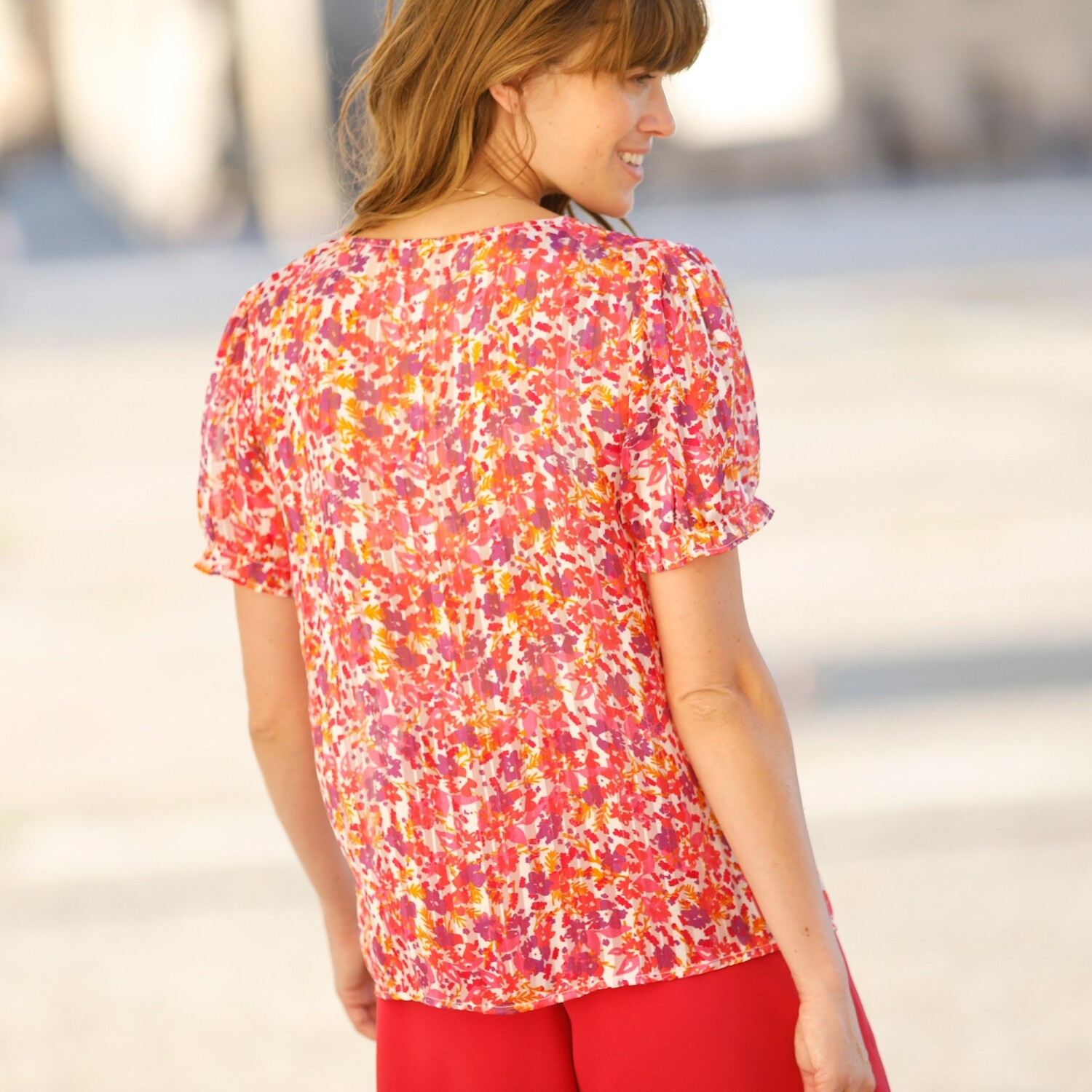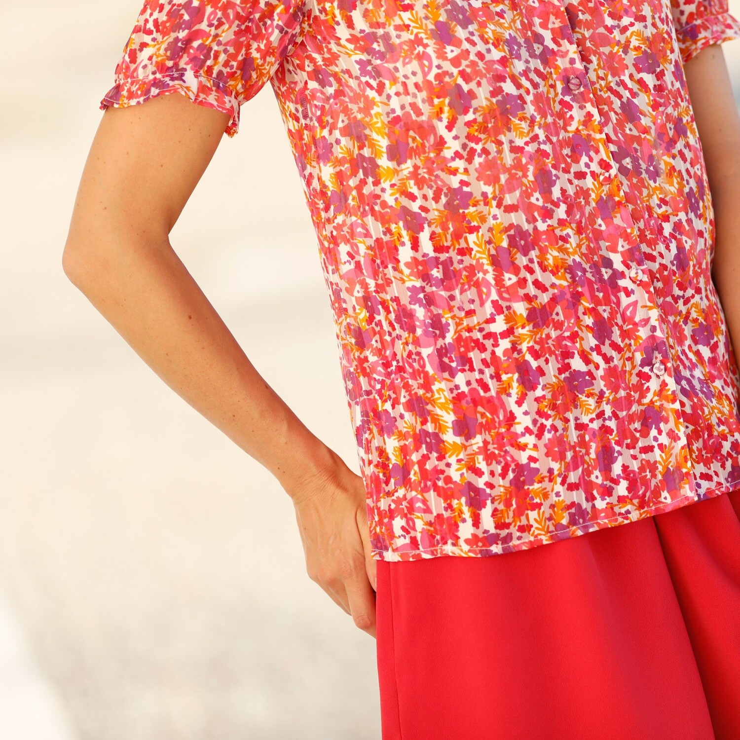 Ez a csíkos hatású blúz divatszerelem lesz első látásra. Plusz egy pasztellszínű virágmotívummal. Lekerekített nyakkivágás. Gombos elülső rész. Mindkét oldalon rojtos nyakkivágás. Rövid blúz ujjak, váll nélküli szabással. Egyenes szegély. Gépben mosható.