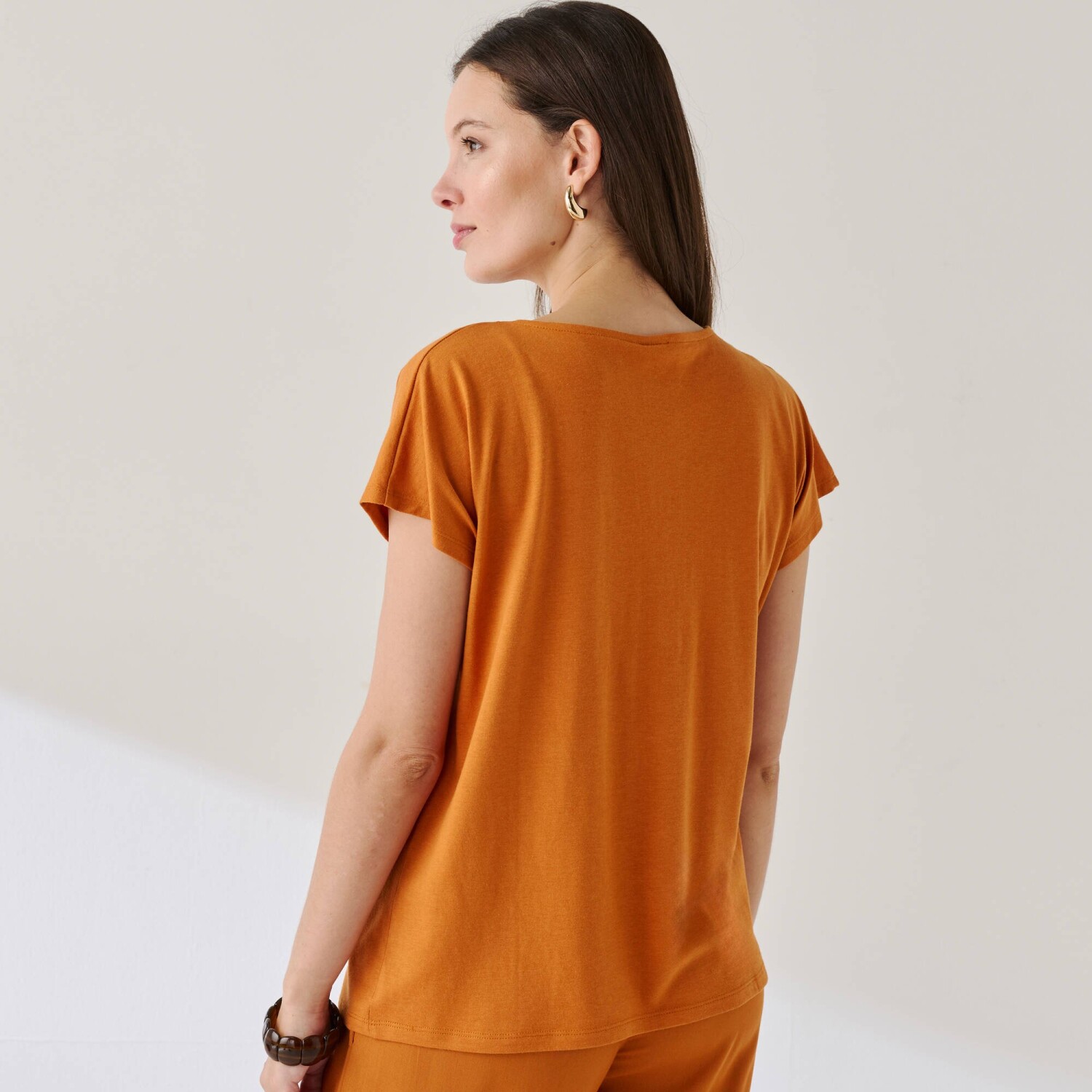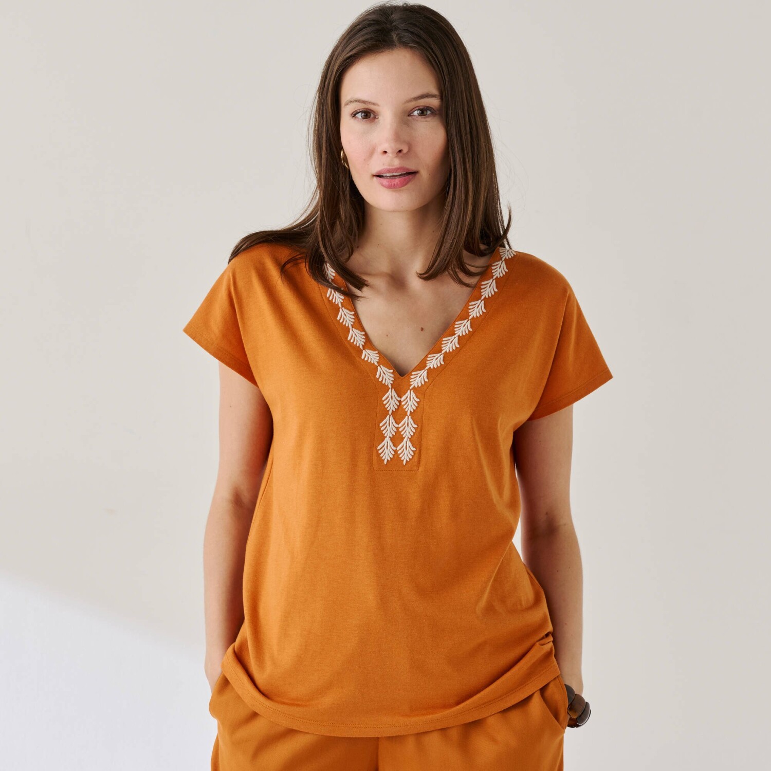 Oeko-Tex minősítésű pamut, laza szabás, kontrasztos hímzés - ezek egy divatos póló kifinomult részletei. Laza szabás. Kerek nyakkivágás. Szív alakú folt a mellkason. Rövid ujjú. Egyenes szegély. Mosógépben mosható.
