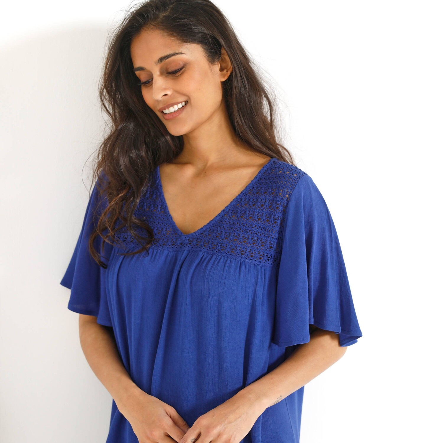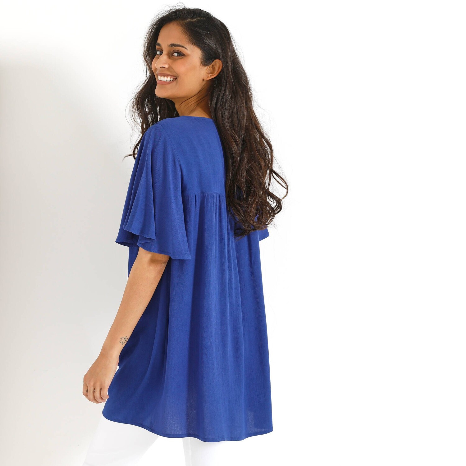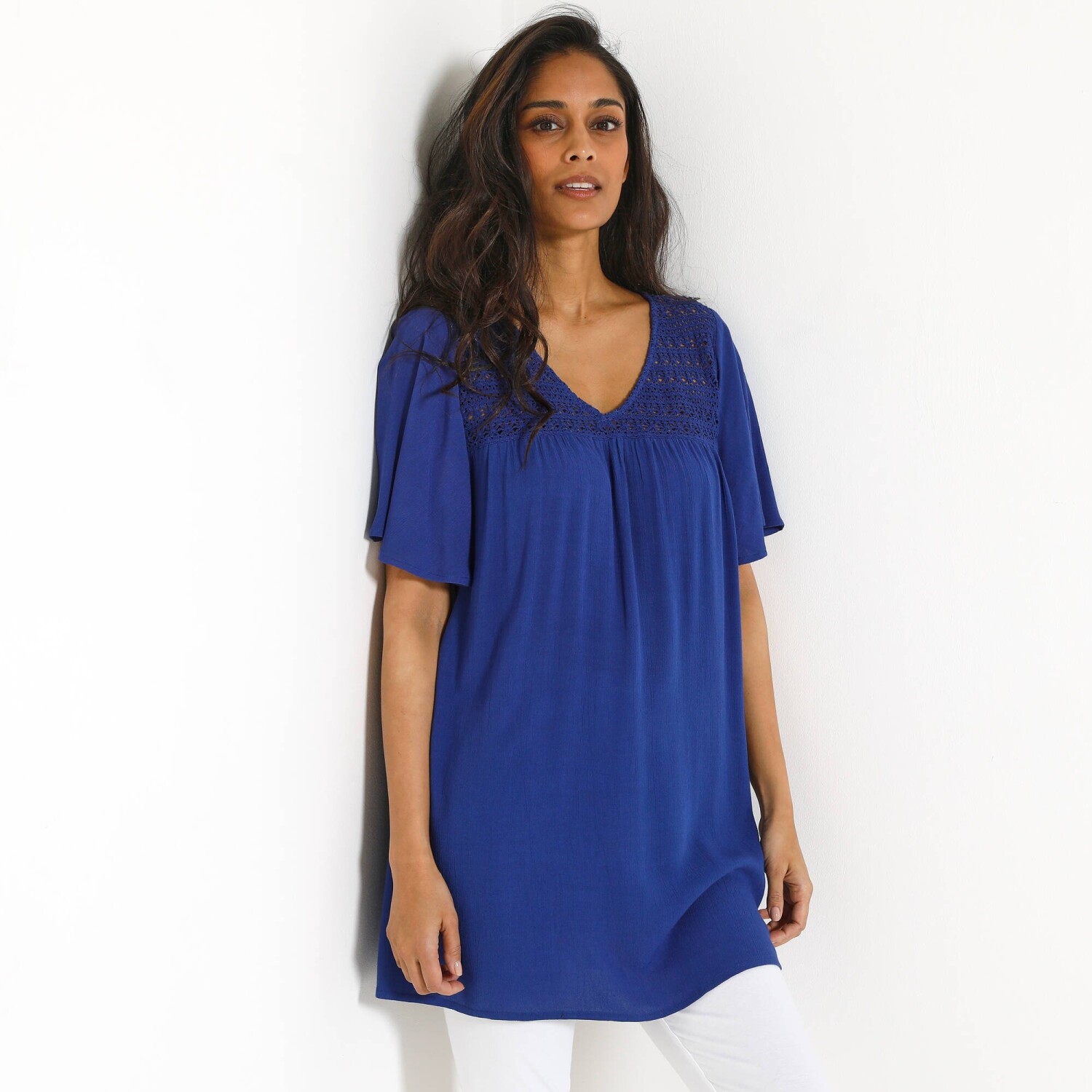 Csíkos és virágminta díszíti ezt a bő, bővülő tunikát, amely minden nőnek jól áll. Kerek nyakkivágással és gombos hasítékkal. Elülső betét, hátul hajtások és horgolt részletek. 3/4-es ujjak. Egyenes, bő alsó szegély. Mosógépben mosható.