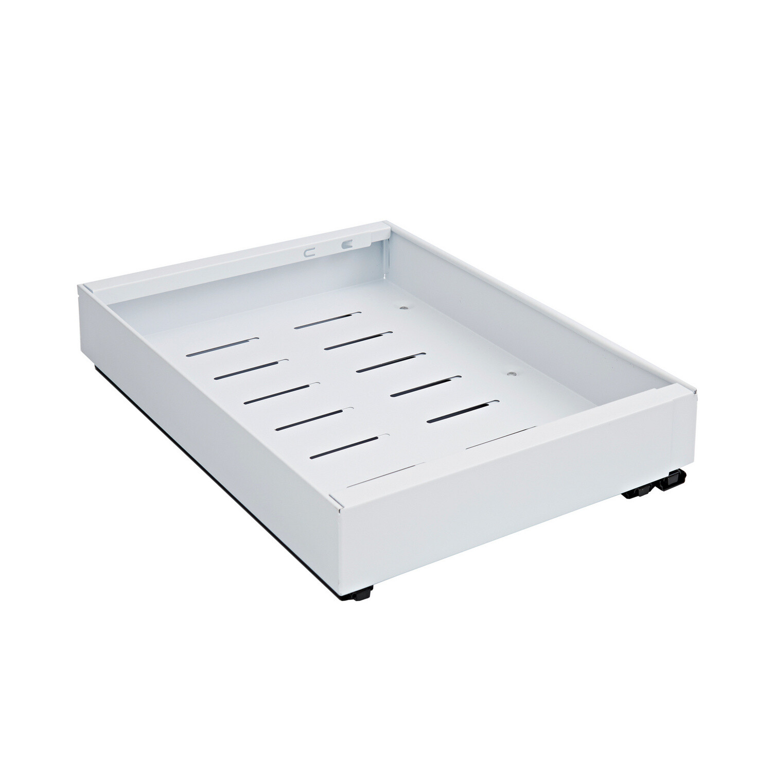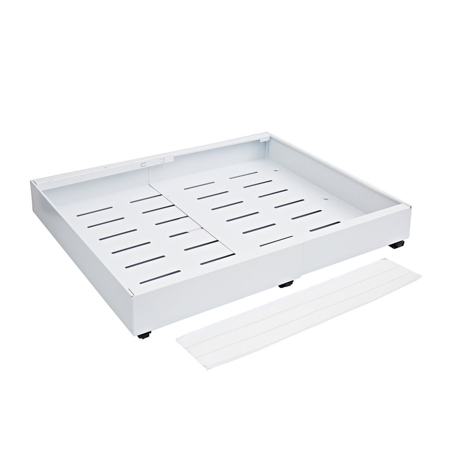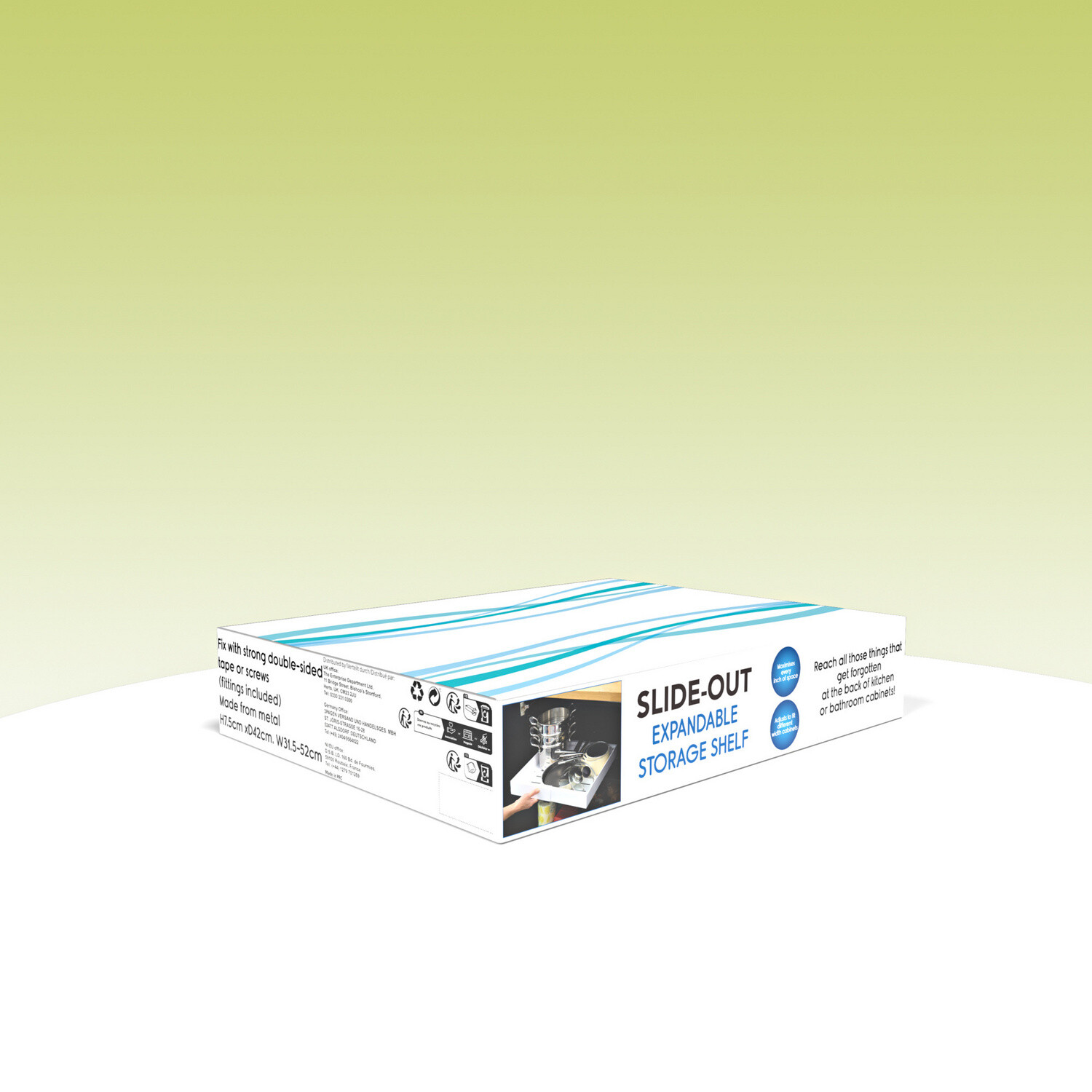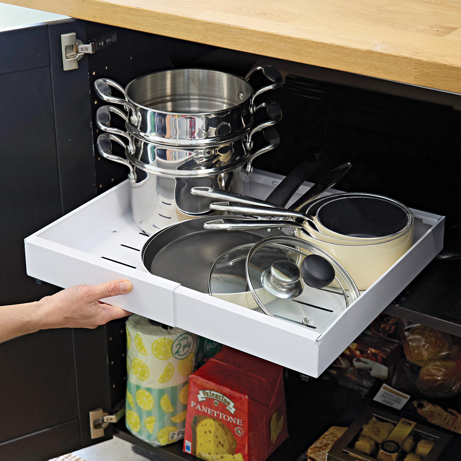 Megspórolja a hajolgatást és a keresgélést. Stabil fém rögzítés, amely fiókként kihúzható. Előre tolja a szekrények hátsó rekeszeit. Legyen szó edényekről, palackokról vagy kellékekről, minden rendben és készenlétben van. Állítható szélesség 31,5 és 51,5 cm között. Nagy szekrényekhez egyszerűen használjon többet. Könnyen rögzíthető: csavarok és erős kétoldalas ragasztószalag tartozék.