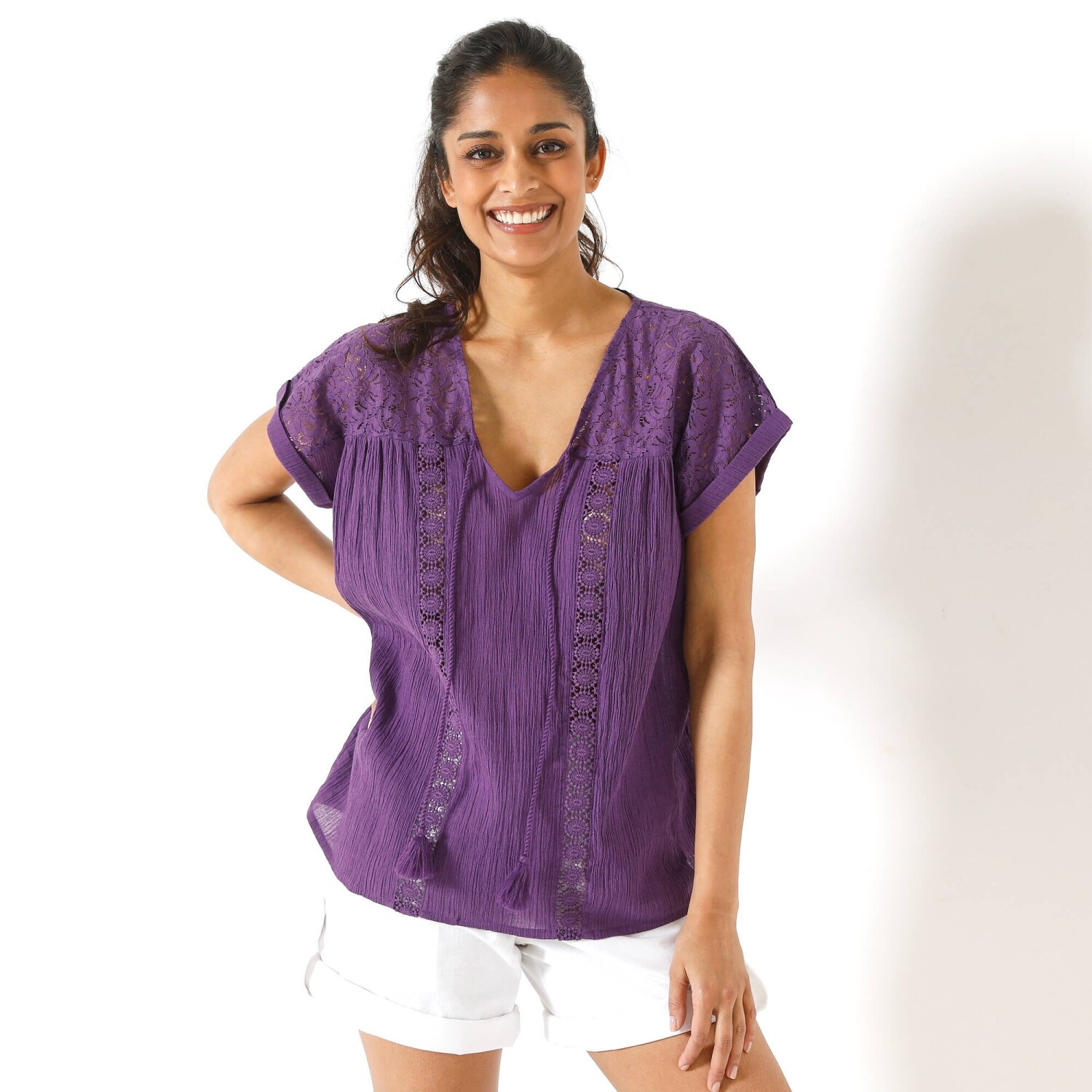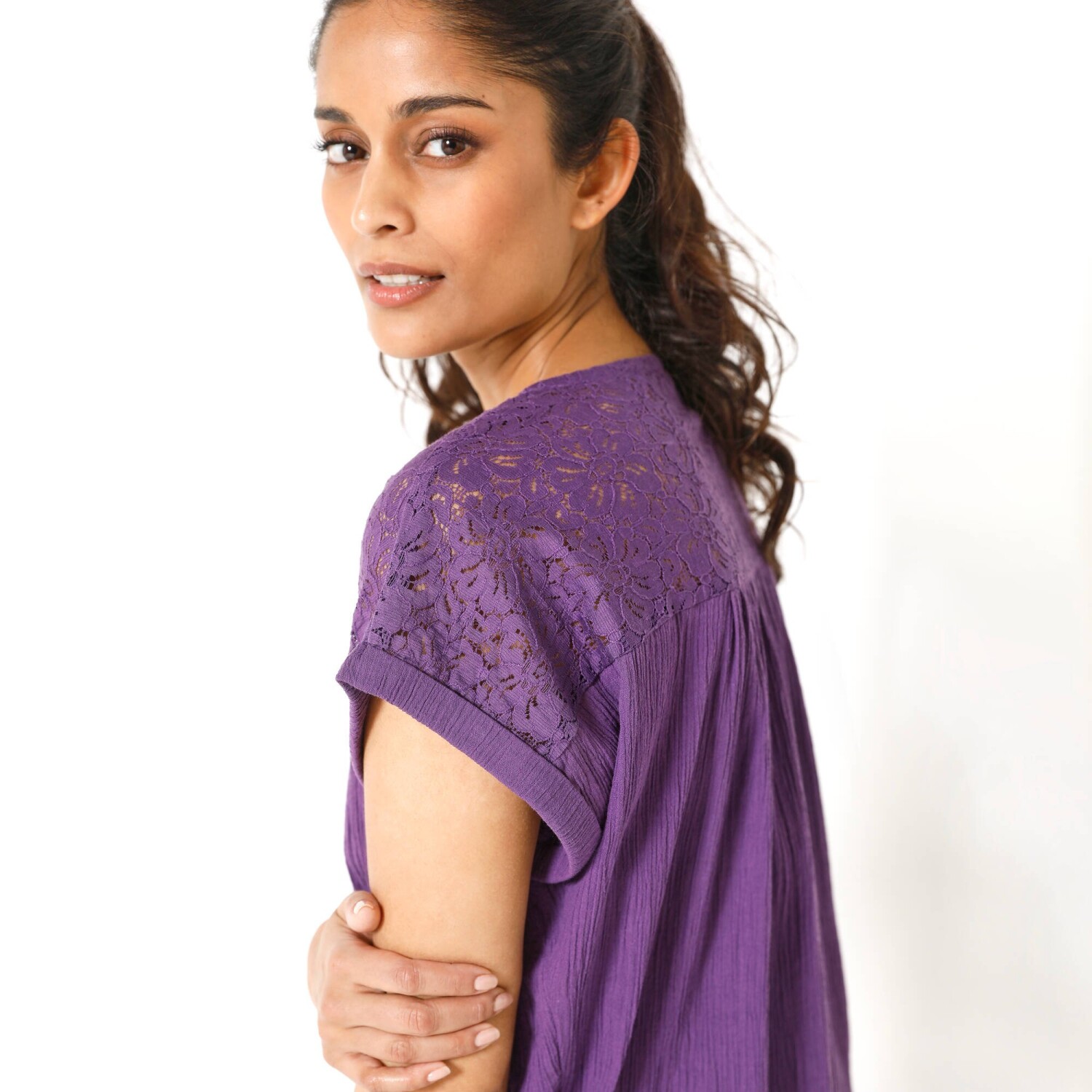 blúz szélesebb szabású és horgolt részletekkel rendelkezik! Kerek nyakkivágás bélelt. Betét és rakások. Gombos gombolás elöl. Horgolt díszítés a gombolás teljes hosszában. Széles hosszú ujjak. Gombos mandzsetta. Rakások a vállon és az ujjak végén. Ingszerű, enyhén lekerekített alsó szegély. Mosógépben mosható.