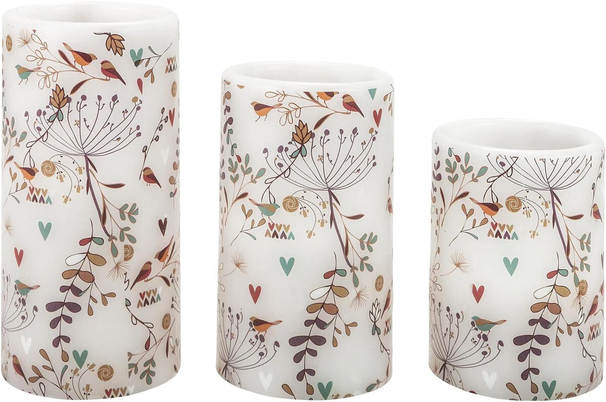 Három gyönyörű, valódi viasz gyertya különböző méretekben, finom virág-, madár- és szívmintákkal díszítve, meleg fehér fényt sugároznak otthonában. Teljesen biztonságosak, viaszcsepegés nélkül – LED technológiával. Praktikus 6 órás időzítővel, amely automatikusan be- és kikapcsolja a fényt. Működés: 2x AA elem gyertyánként (nem tartozék). Méretek: átmérő 7,5 cm; magasság 10 cm, 12,5 cm, 15 cm.