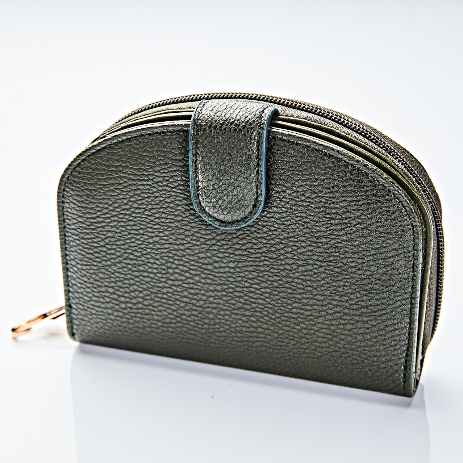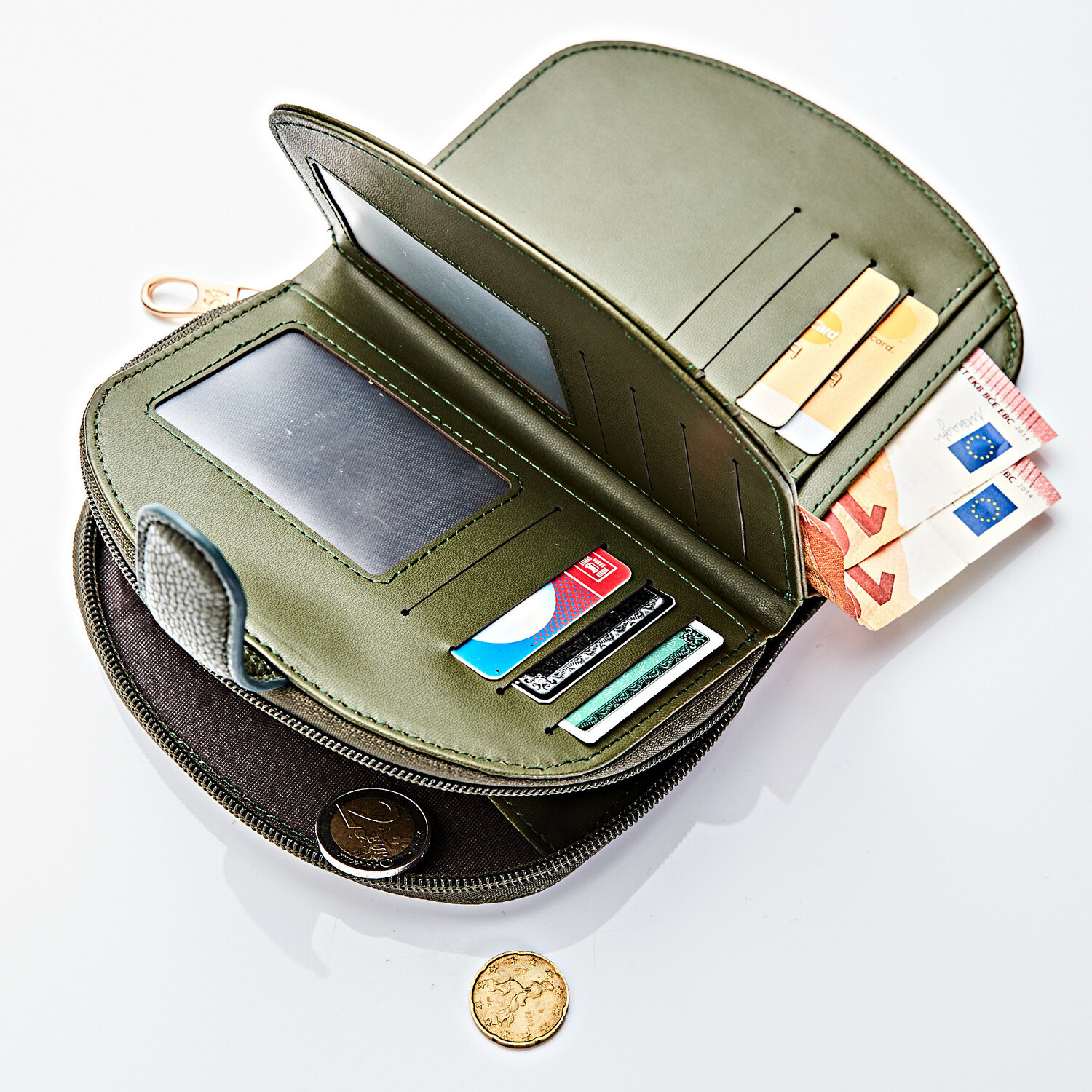 Kompakt és átlátható, rekeszekkel a papírjegyzetek és kártyák számára. Cipzáras érmés rekesz.