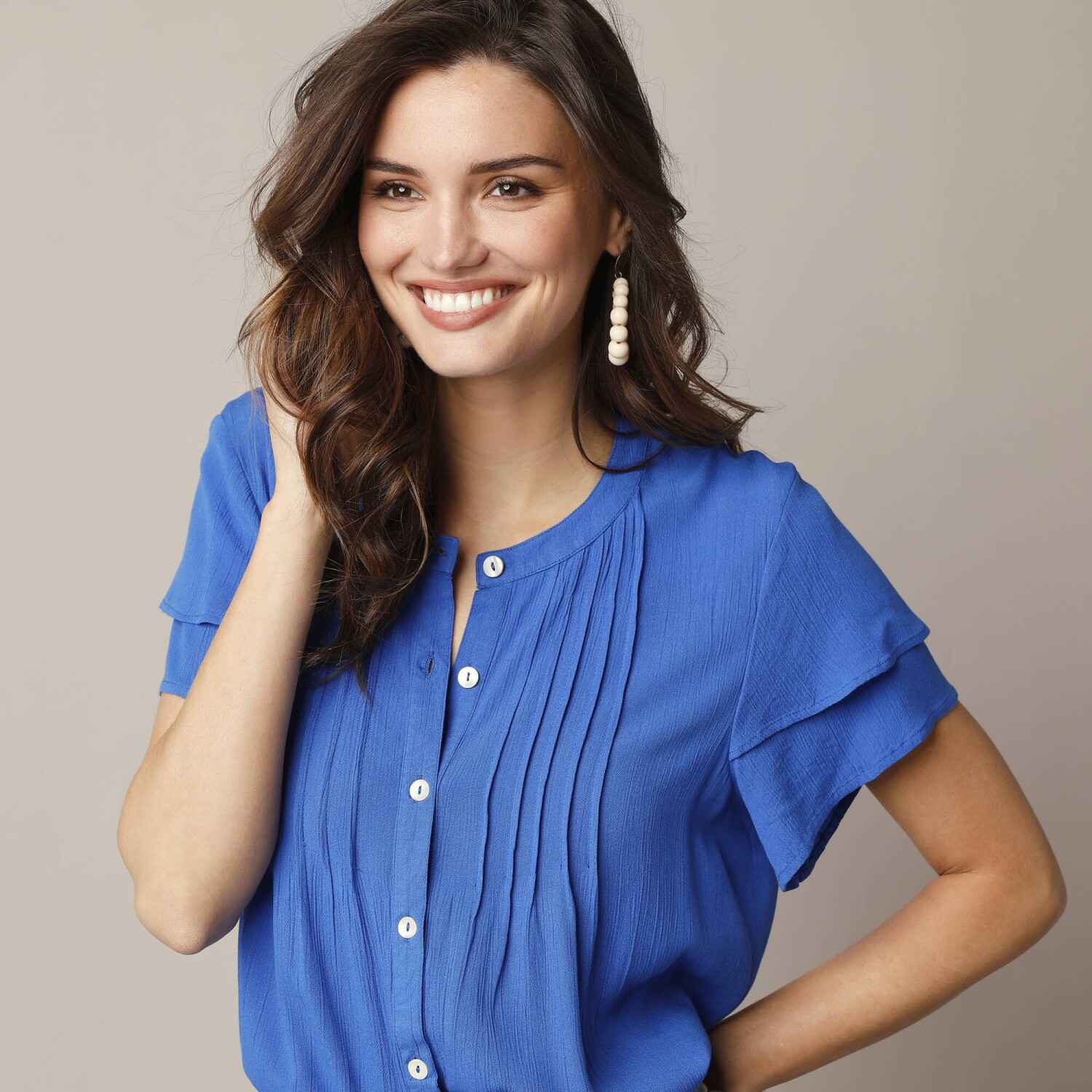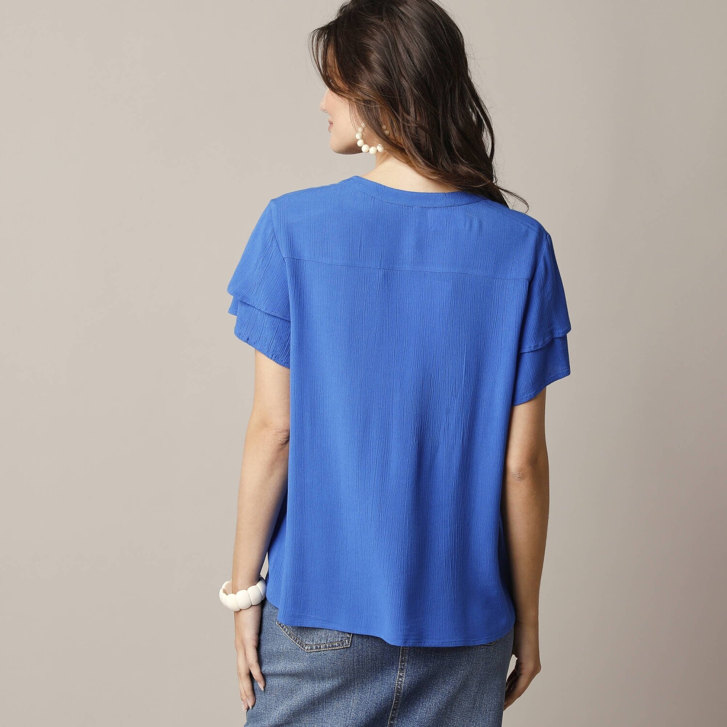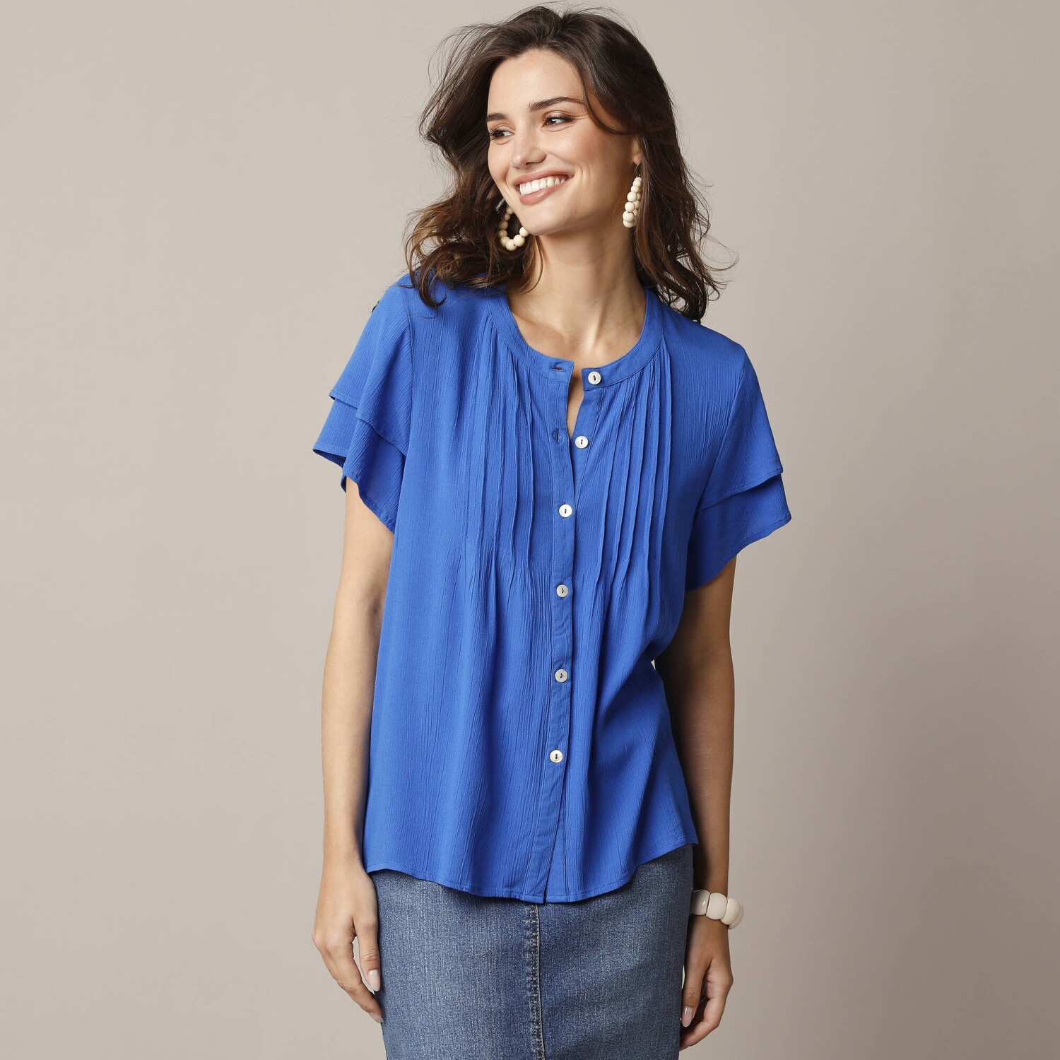 Szeressen bele ebbe a trendi, szövetmintás blúzba. Fodros részletekkel, laza szabással és fodros vállakkal egyszerűen tökéletes. Kerek fodros nyakkivágás gombokkal és hálós nyakkivágással. Varrott elülső rész. Hosszú ujjak. Fodrok a vállakon. Gombos mandzsetta résszel. Egyenes szegély. Gépben mosható.