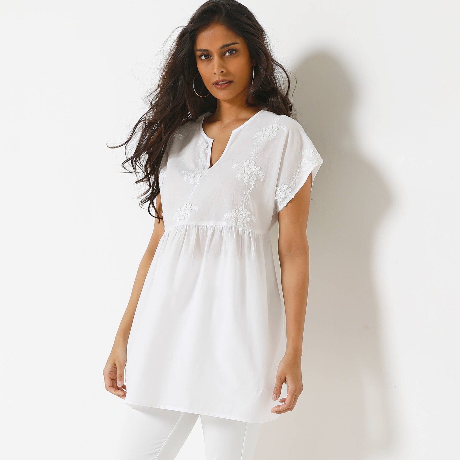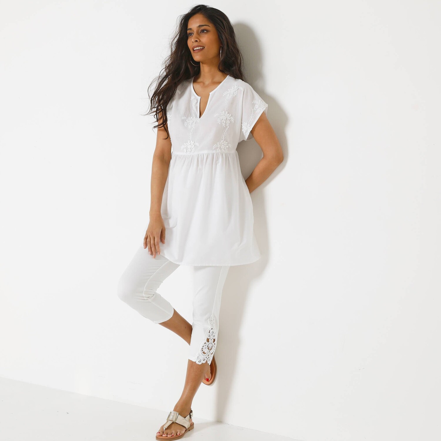 A dinamikus megjelenésről egy színes mintás tunika gondoskodik. V-nyakkivágás húzózsinórral és hurkokkal (fűzés). Derékszíjjal ellátott mellény. A mellrész alatt hasítékok és fodrok. Rövid, felhajtott ujjak. Egyenes szegély. Gépben mosható.