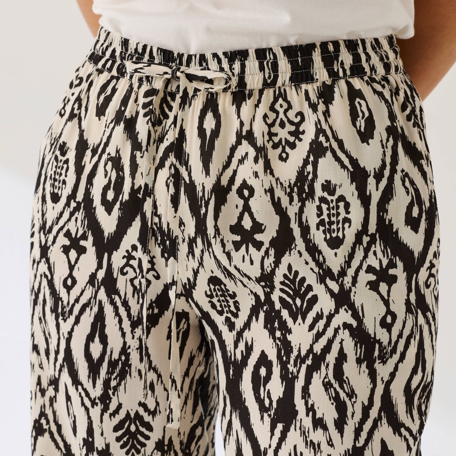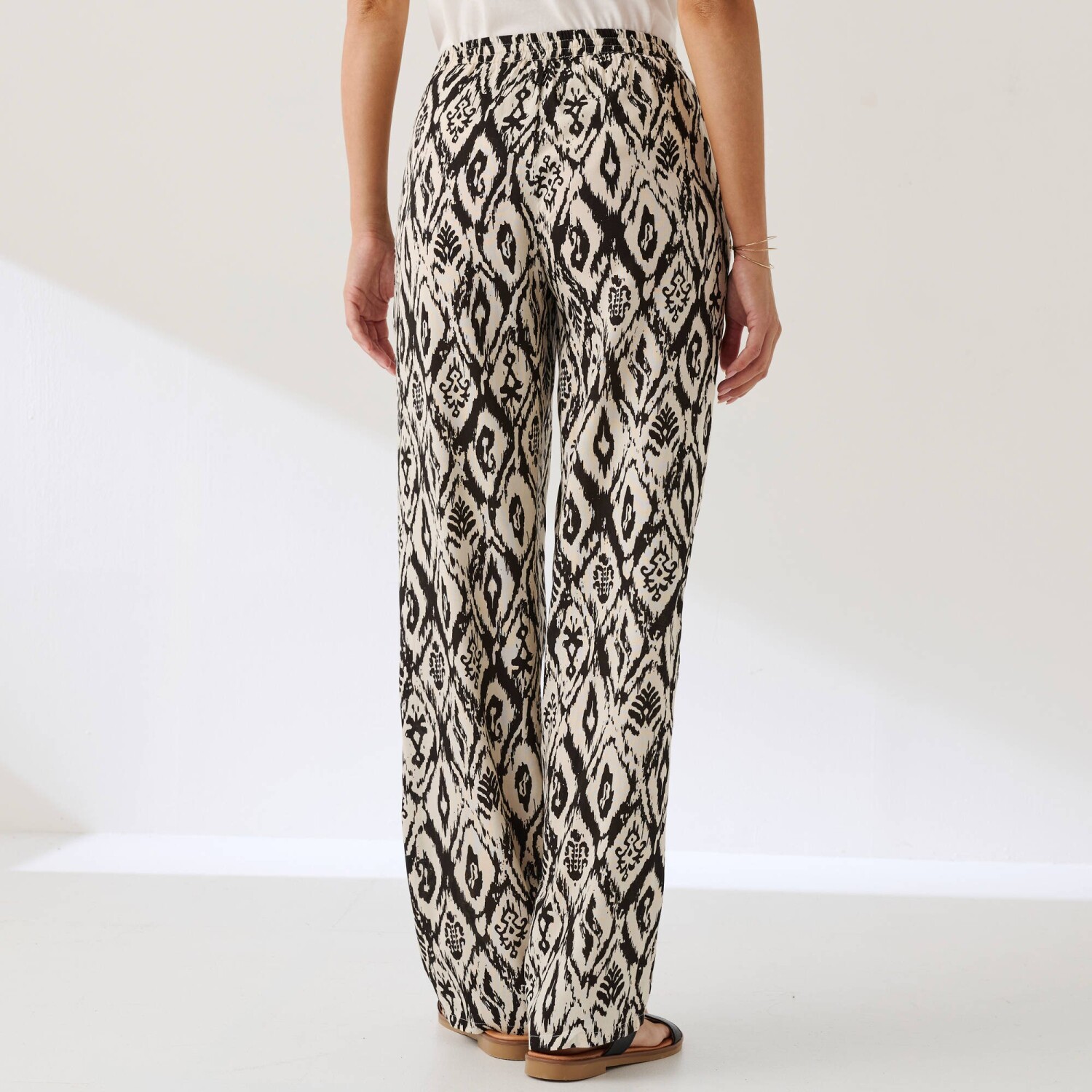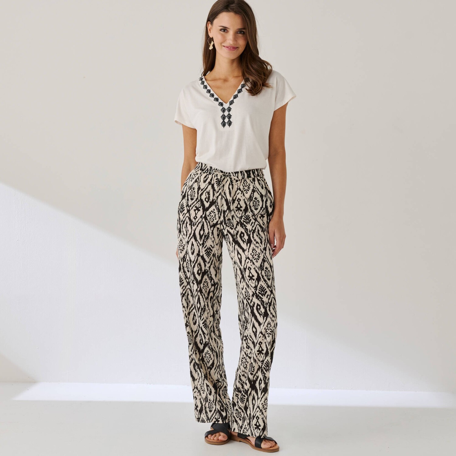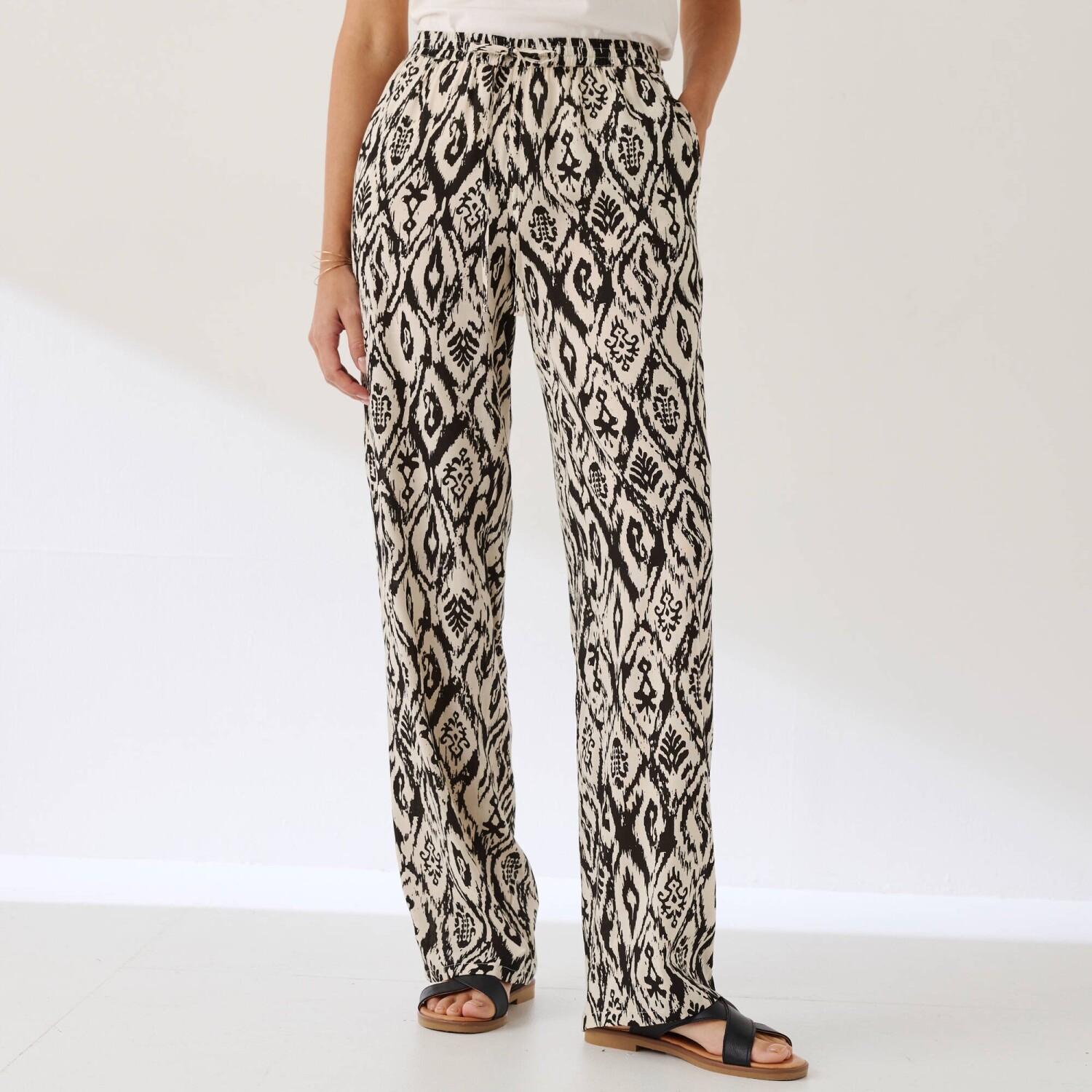Laza eleganciát sugároz, ezek a légies mintás nadrágok ideálisak a nyári időjáráshoz. Khaki és piros színekben, amelyek könnyen kombinálhatók. Légáteresztő nadrág. Bő szabású. Teljes hosszában elasztikus derékrész húzózsinórral. 2 oldalsó zseb. Alsó szegéllyel. Mosógépben mosható.
