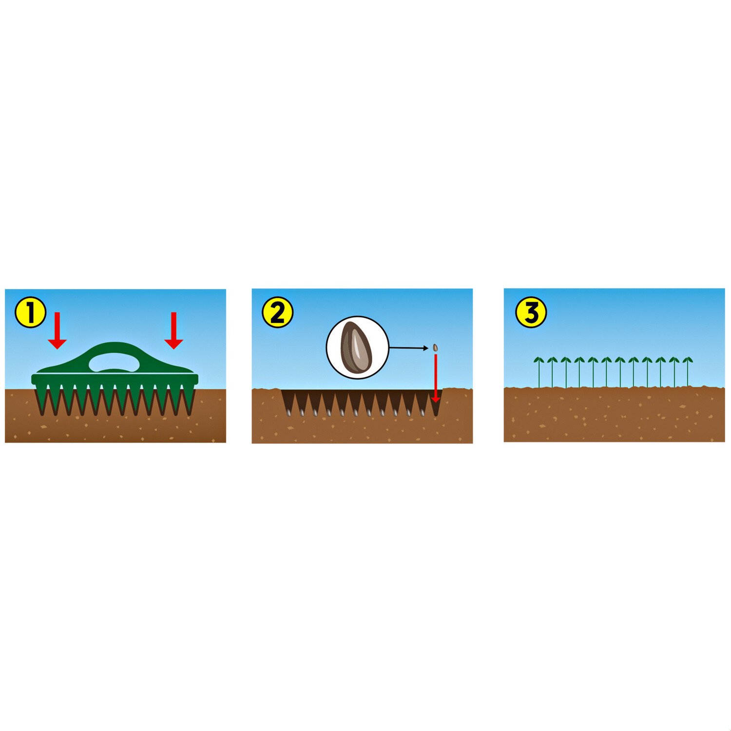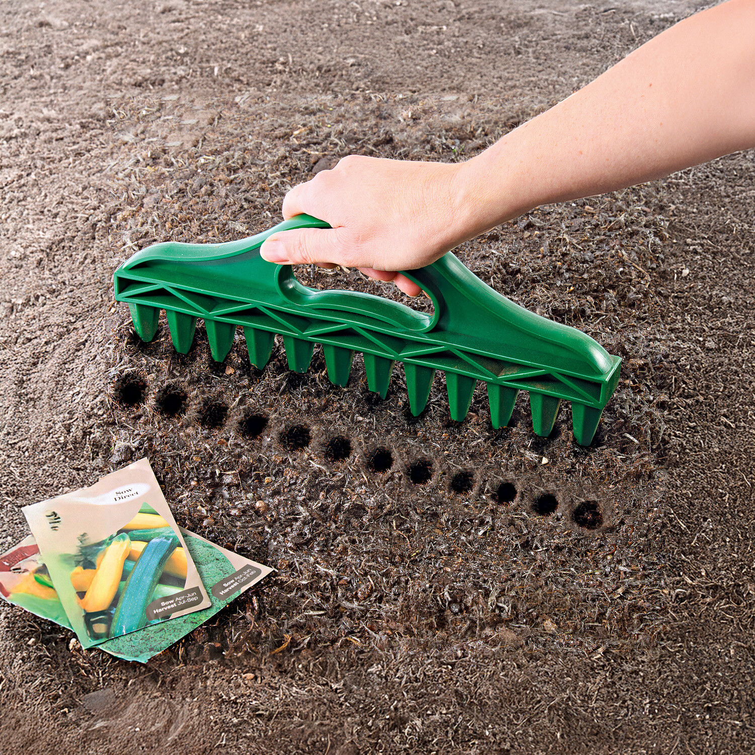 12 ültetőlyuk egyszerre! Gyerekjáték a professzionális ültetőnek ezzel kényelmes fogantyúval. a 12 tüske biztosítja a magok optimális mélységét és egymástól vett távolságát a magtálcákban és az ágyásokban.