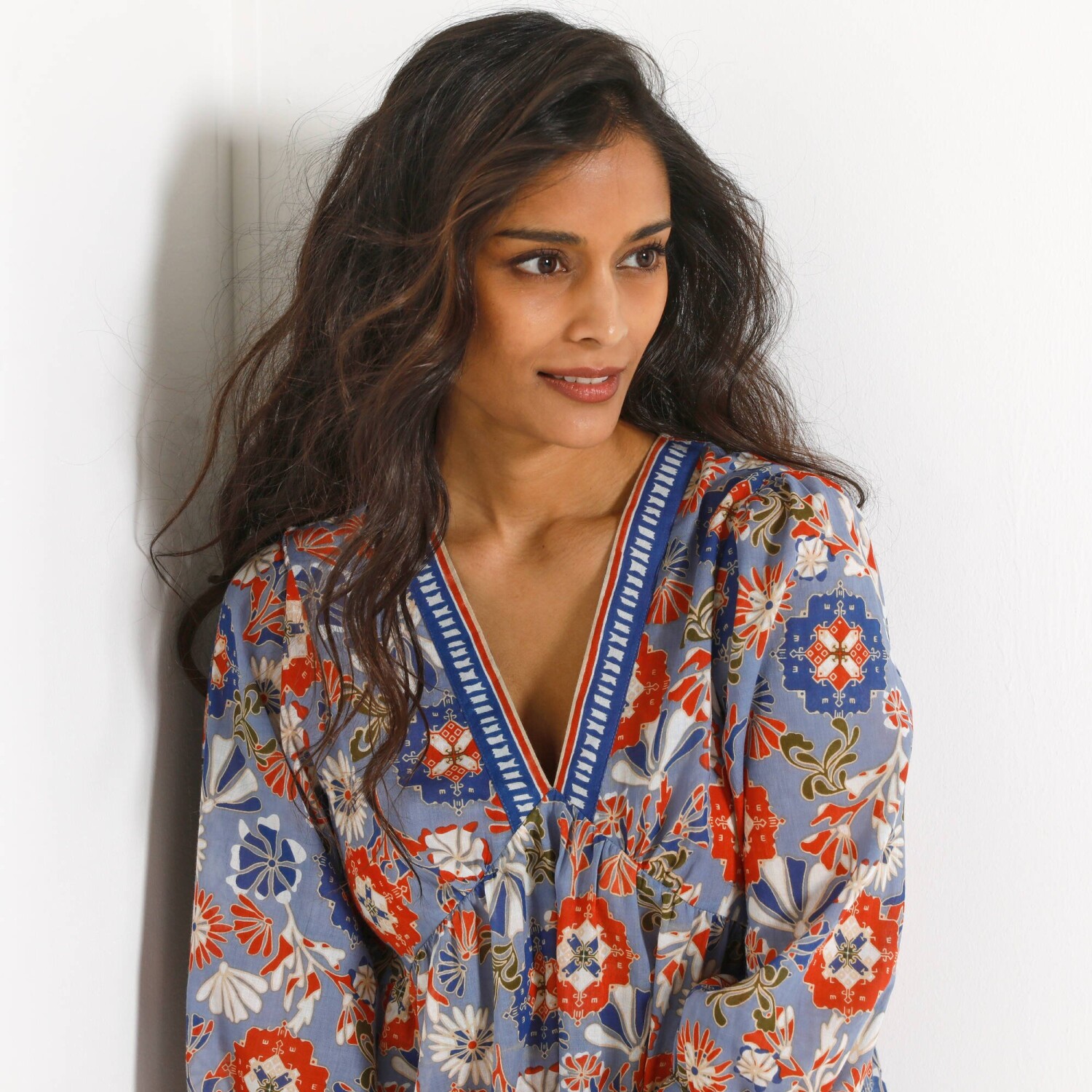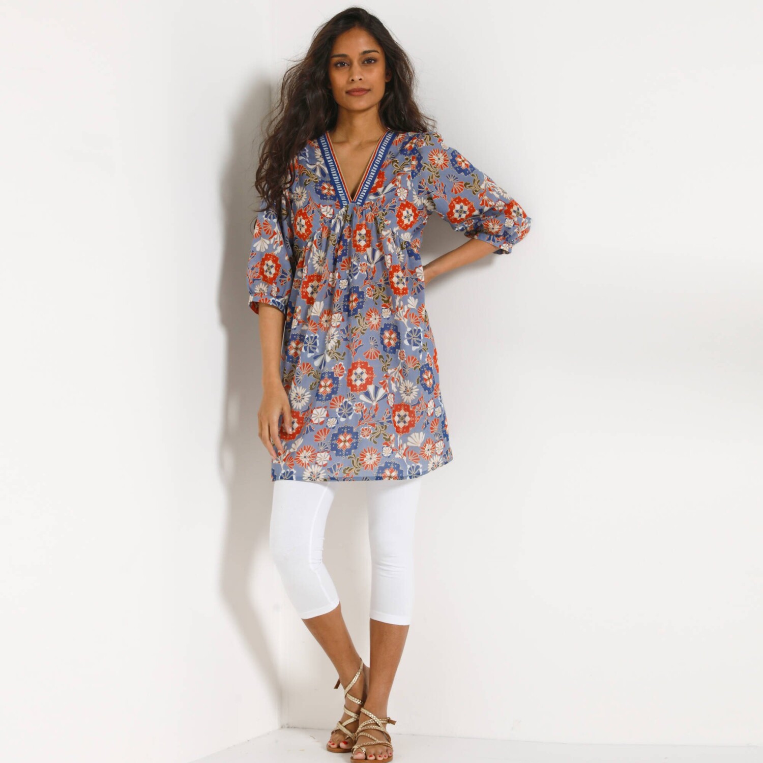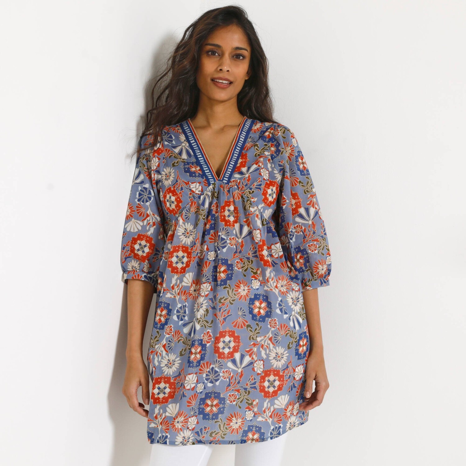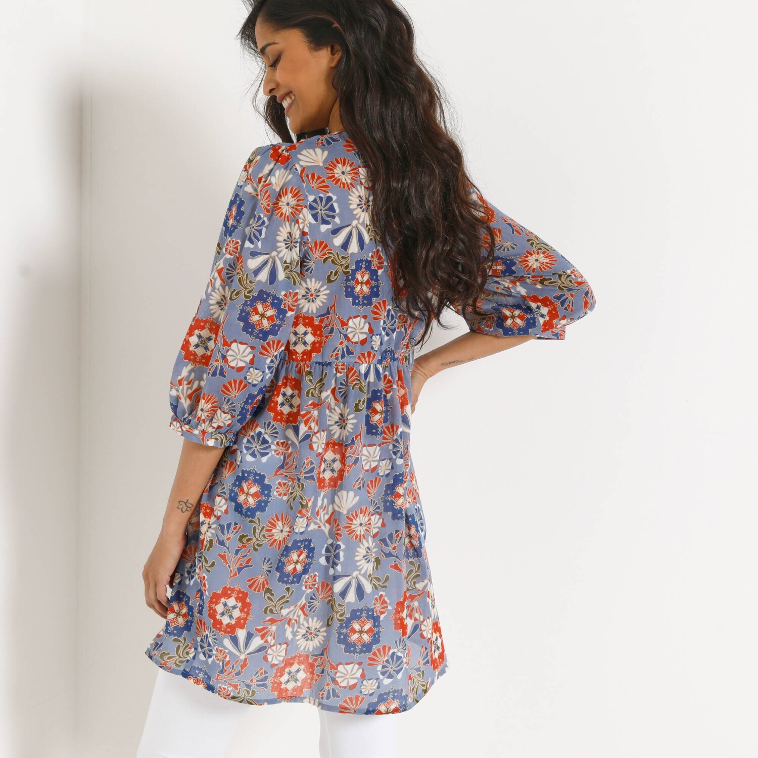 A nőies fodrokkal és makraméval díszített pamut tunika boho megjelenésre fogad. Kerek nyakkivágás. Gombos záróvonal elöl középen (gombok és szemek). Elöl önbefűzős megkötővel. Makramé betét az ujjak alján és tetején. 3/4 széles ujjak bordázott mandzsettával. Hátul kivágás. Egyenes szegély. Gépben mosható.