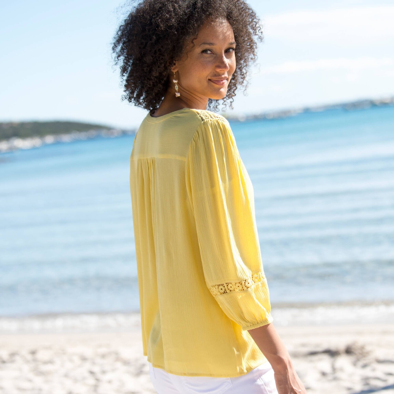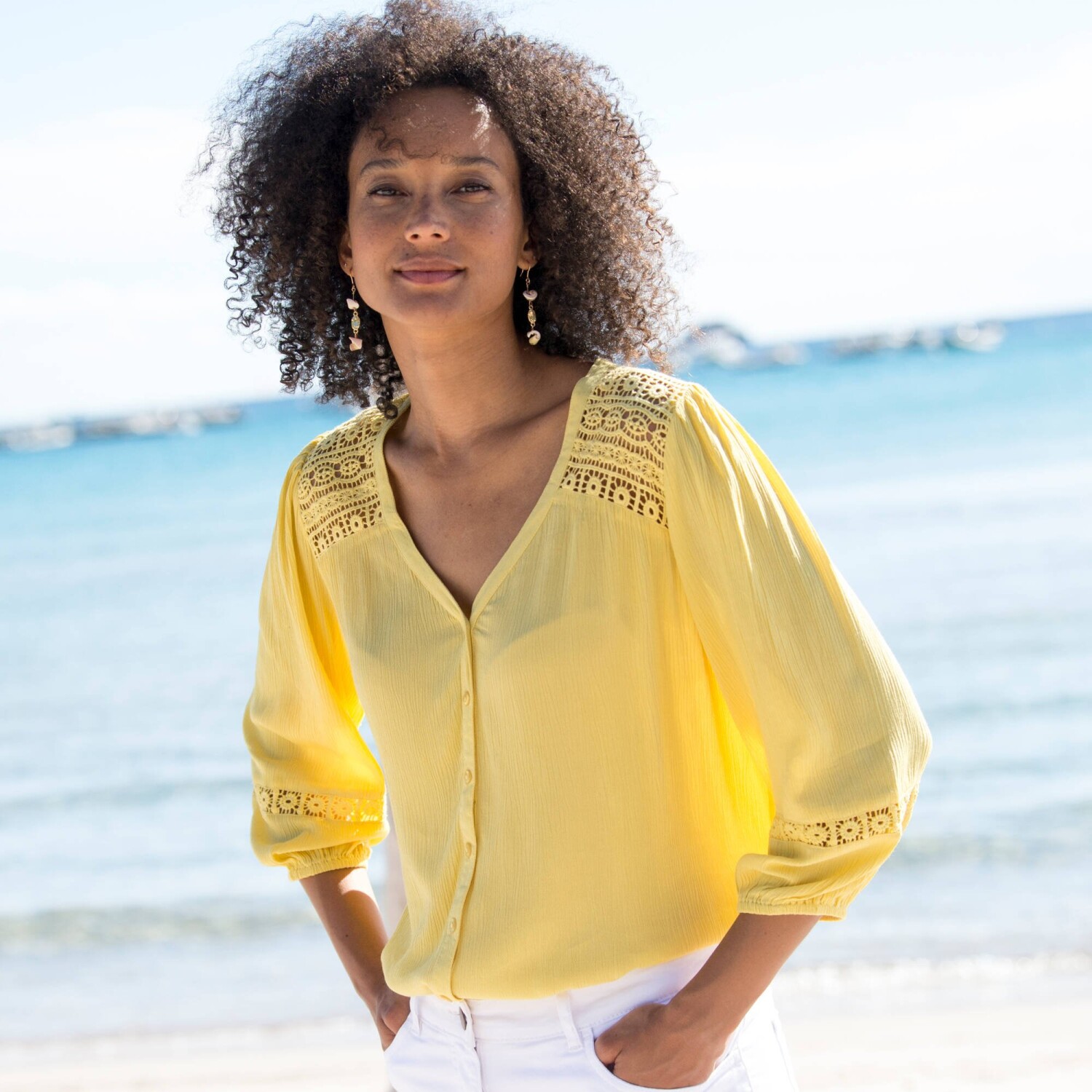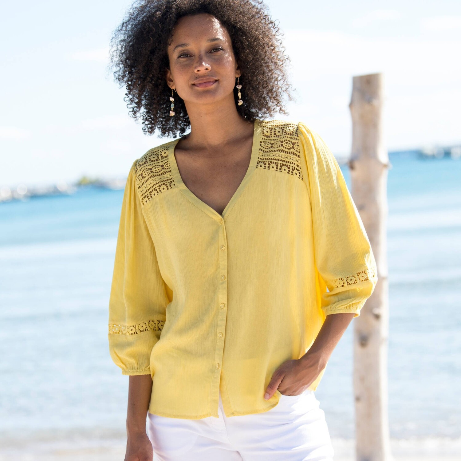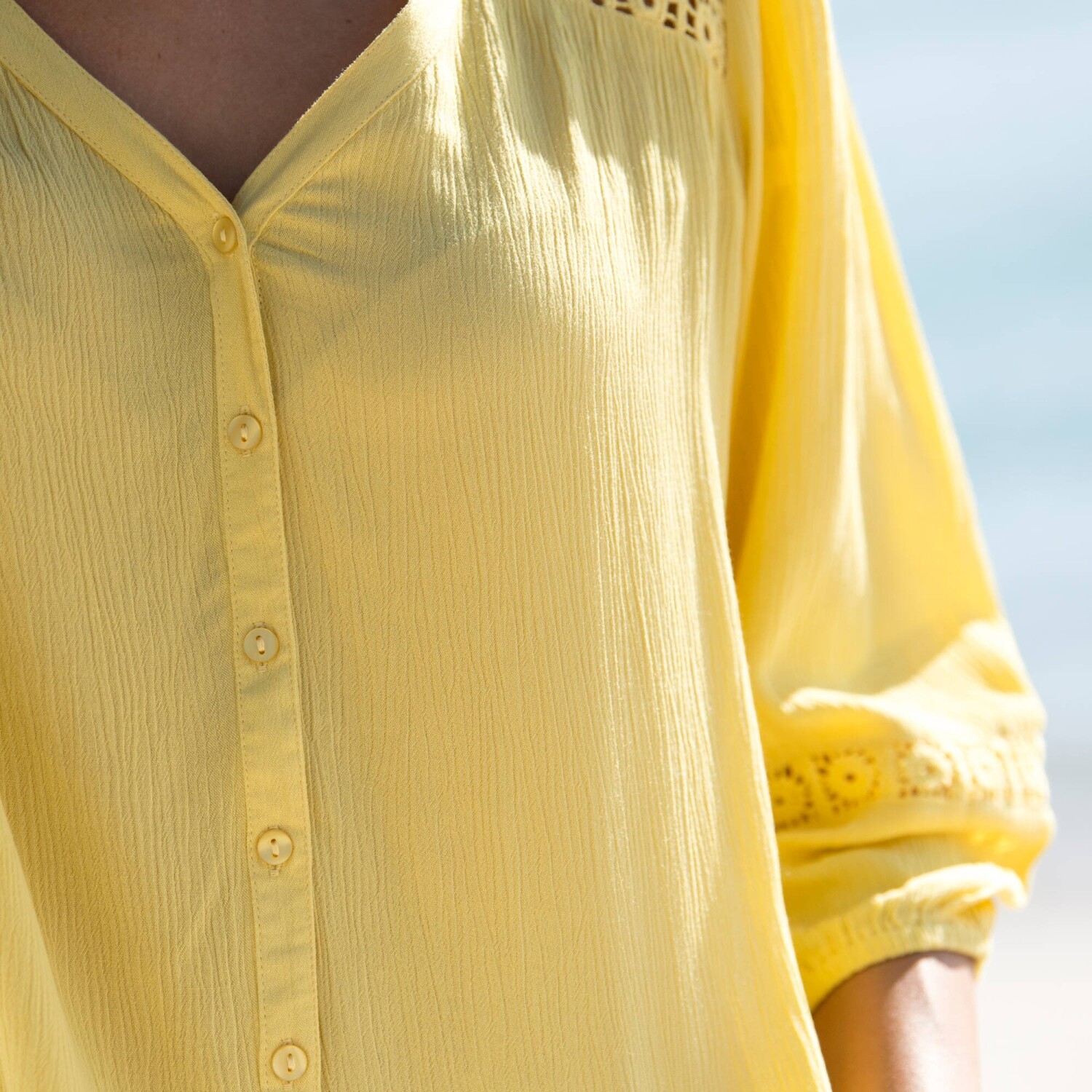 Hímzés, makramé és rengeteg báj - ne hagyd, hogy a divatos blúz elkerülje a figyelmedet! Kerek, laza nyakkivágás résszel és húzózsinórral megkötve. Elöl makramé. Rövid raglan ujjak. Makramé a nyakkivágásnál és az ujjak végén. Egyenes szegély. Gépben mosható.
